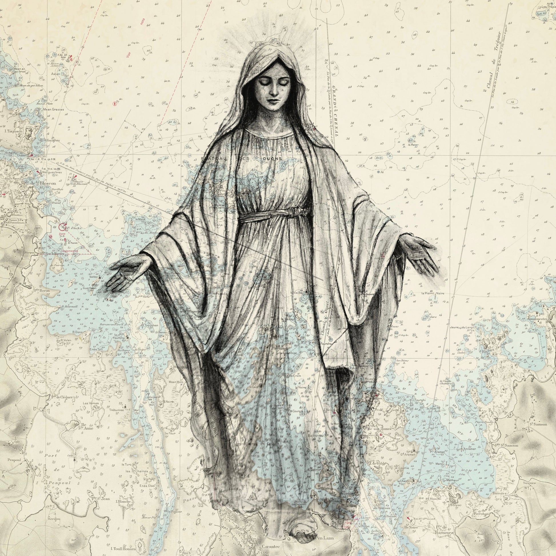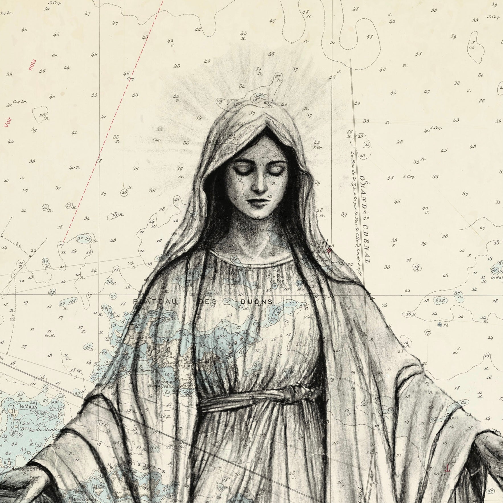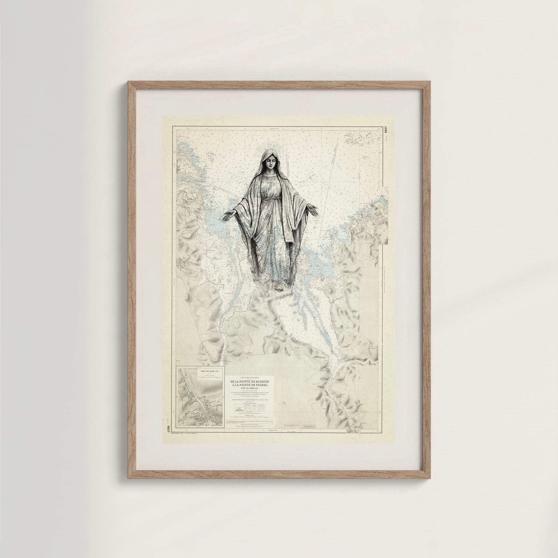 Reproductions éditées à 30 exemplaires, numérotées et signées, de cartes marines anciennes de Bretagne (Baie de Morlaix) illustrées au fusain de la Vierge Marie.