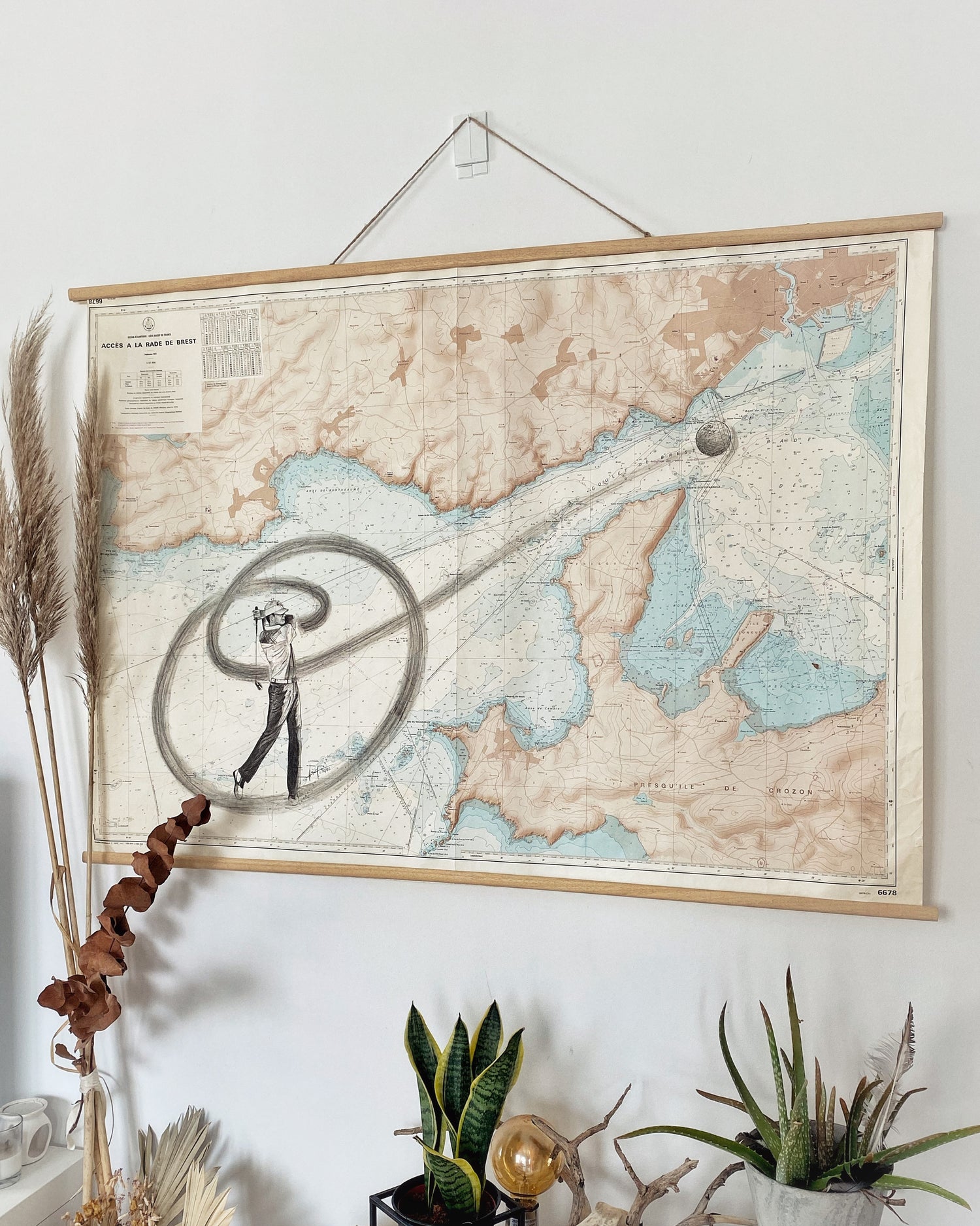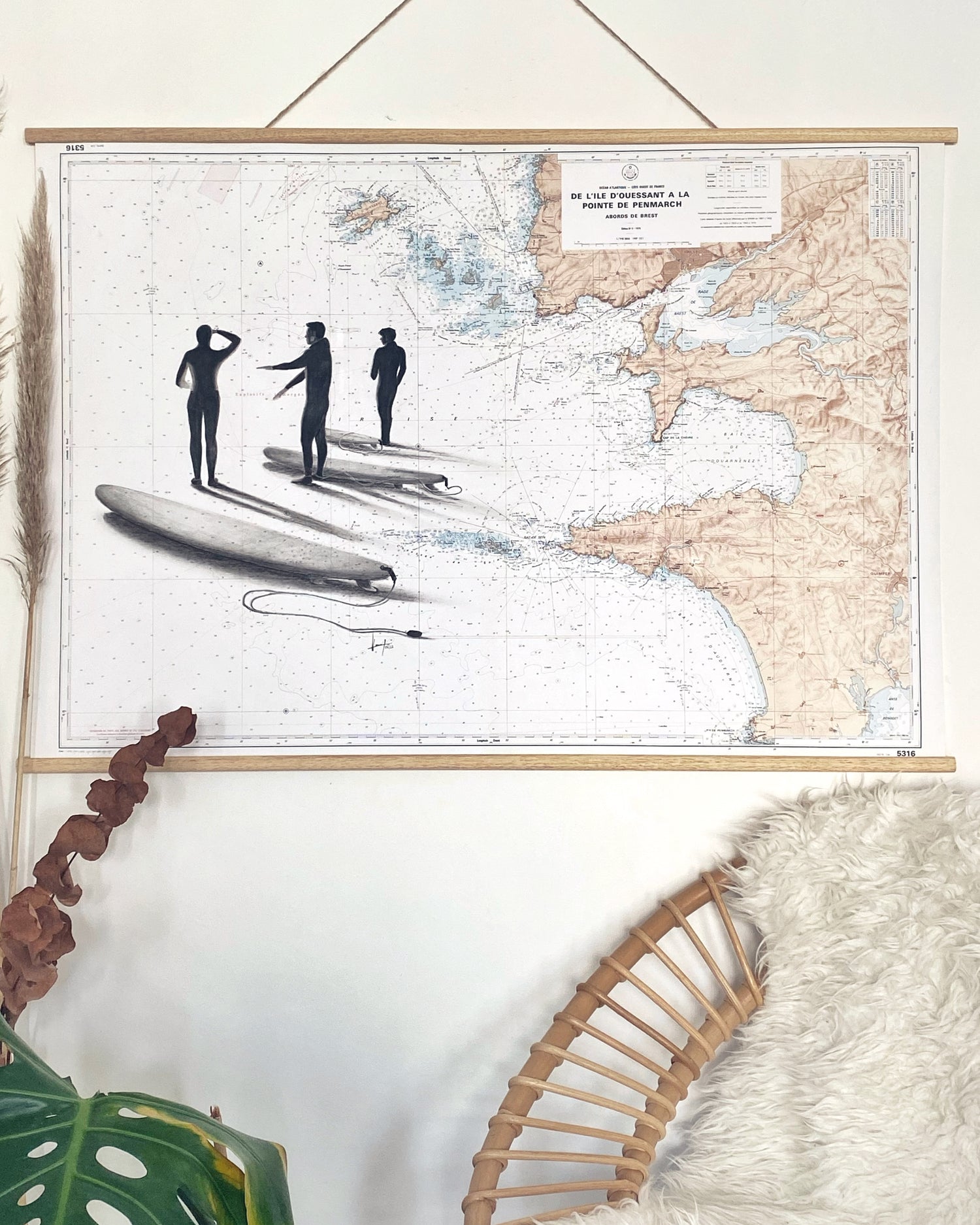 Je vous propose sur différents supports reliés à l’eau (cartes marines, aquarelle à l’eau de mer, Suminagashi), des dessins au fusain personnalisés à la commande, des affiches originales, ainsi que des reproductions imprimées en différents formats.