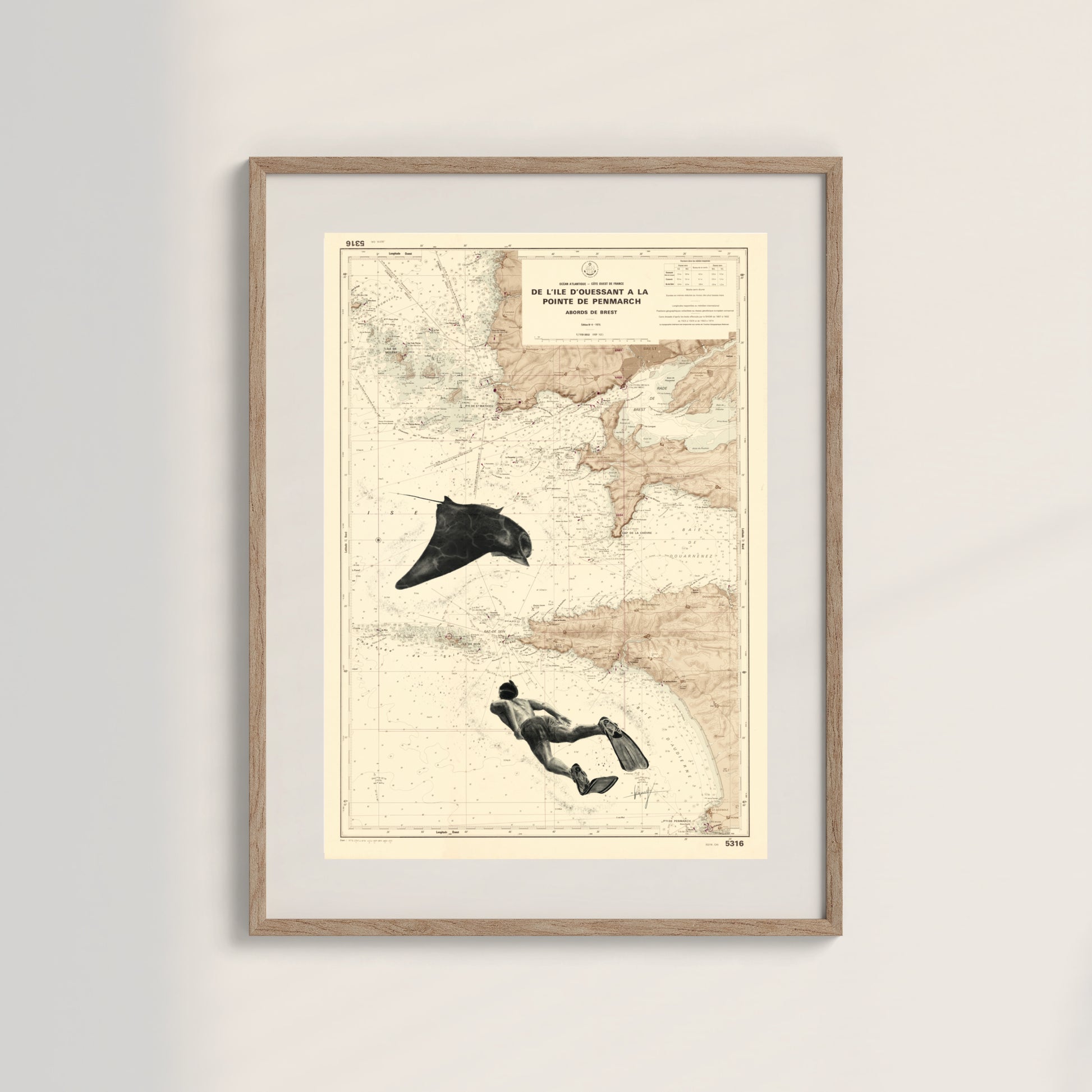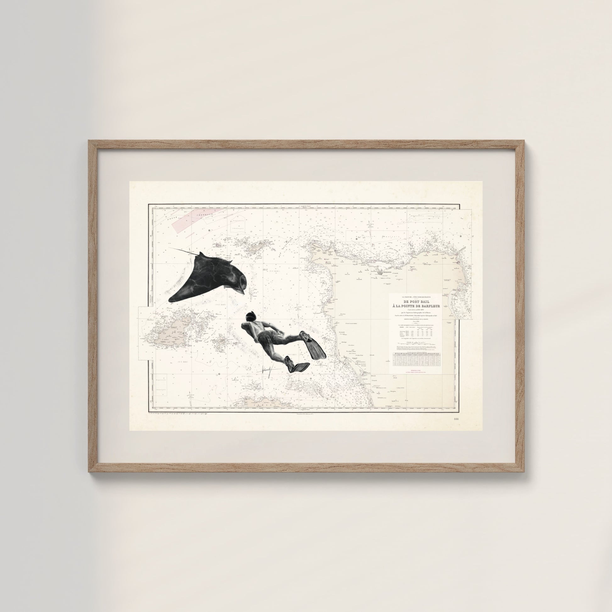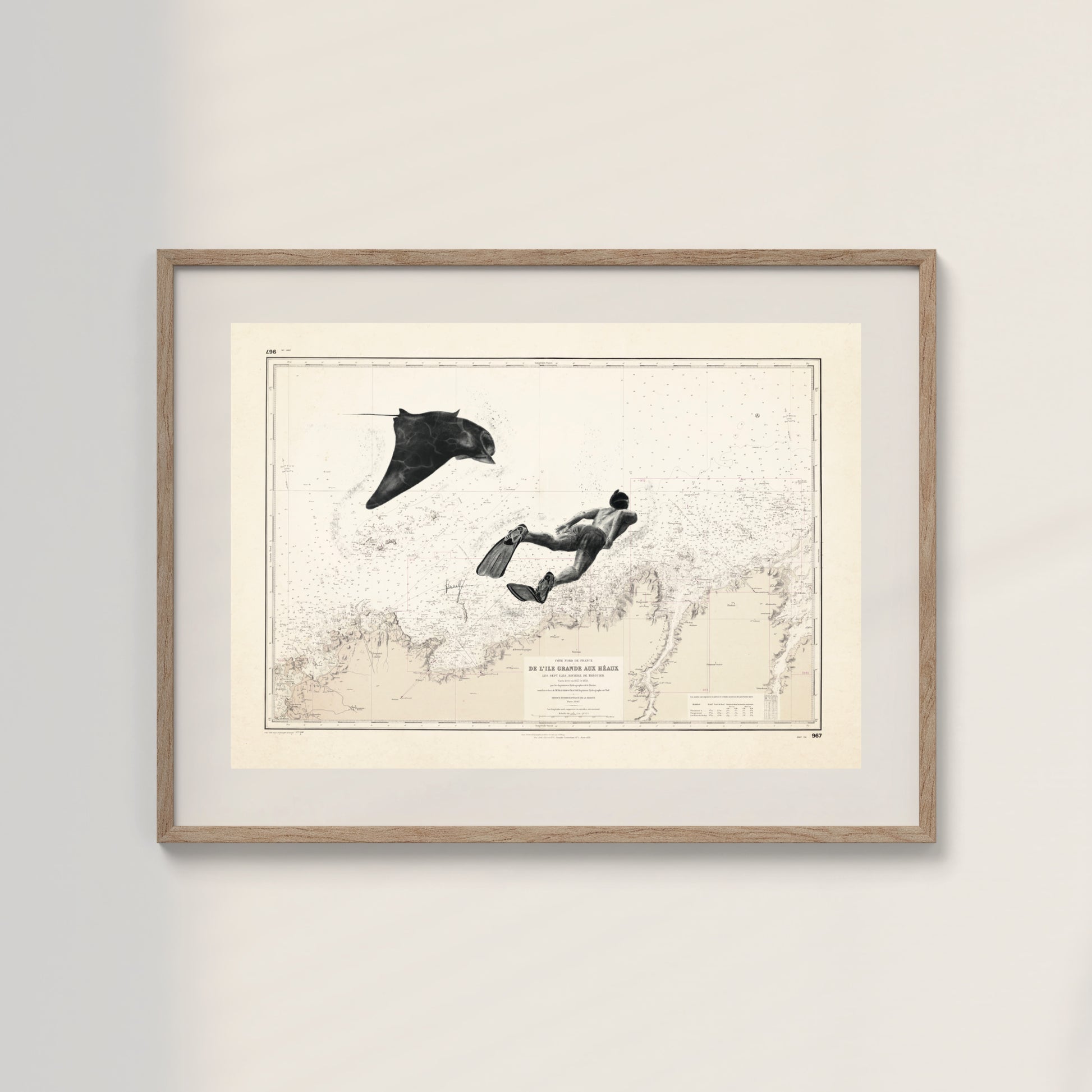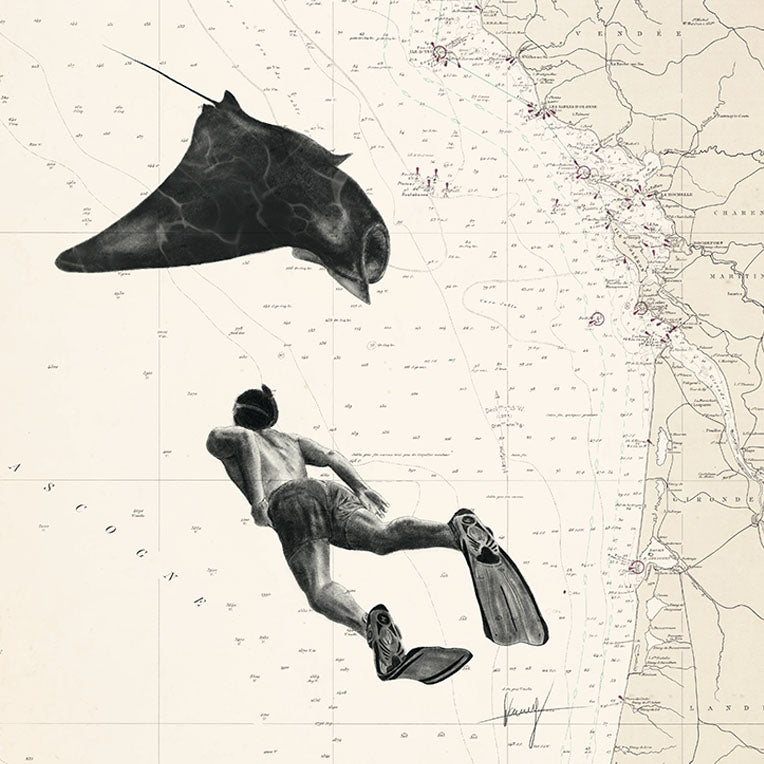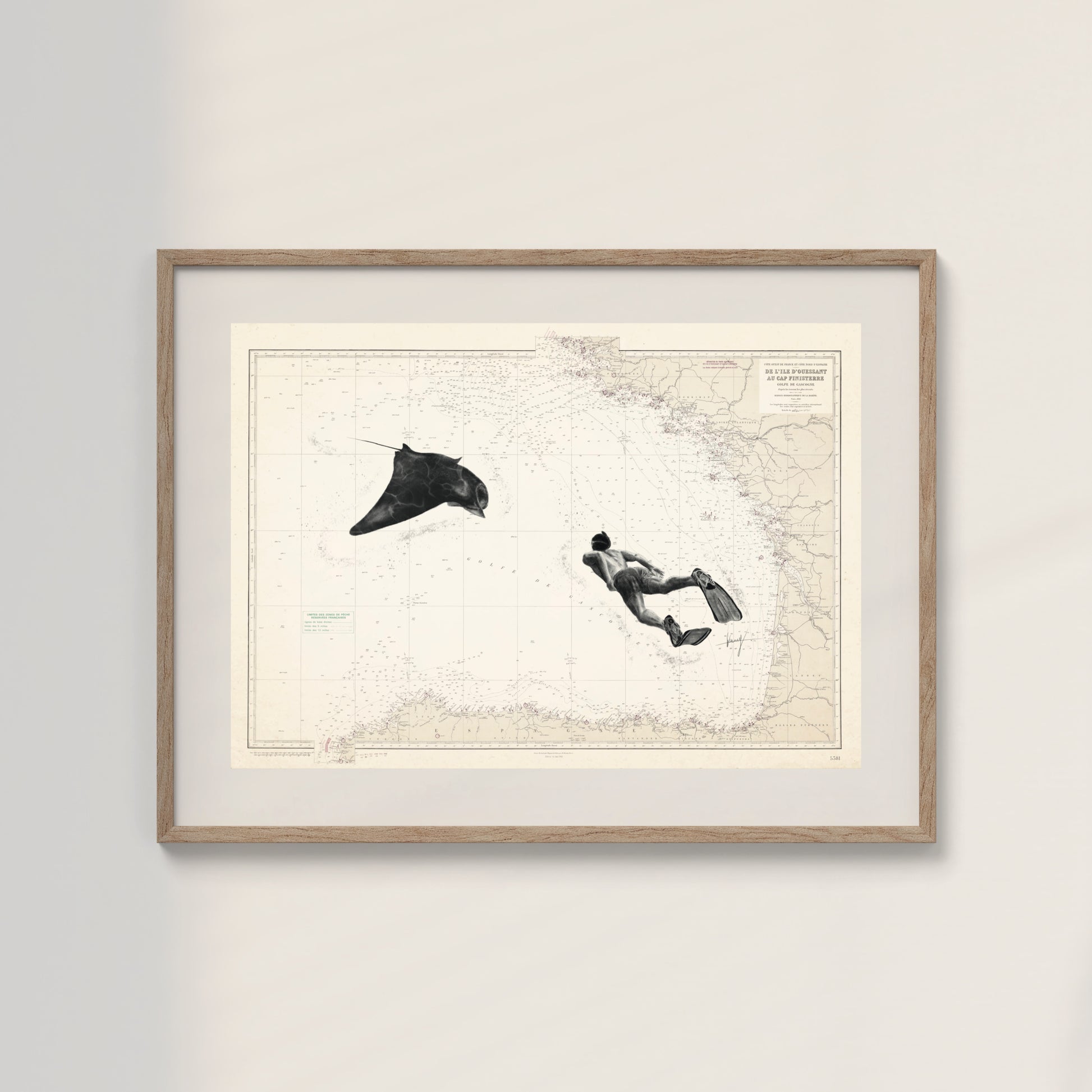 Reproductions de cartes marines anciennes illustrées au dessin numérique d'un plongeur et d’une raie manta.