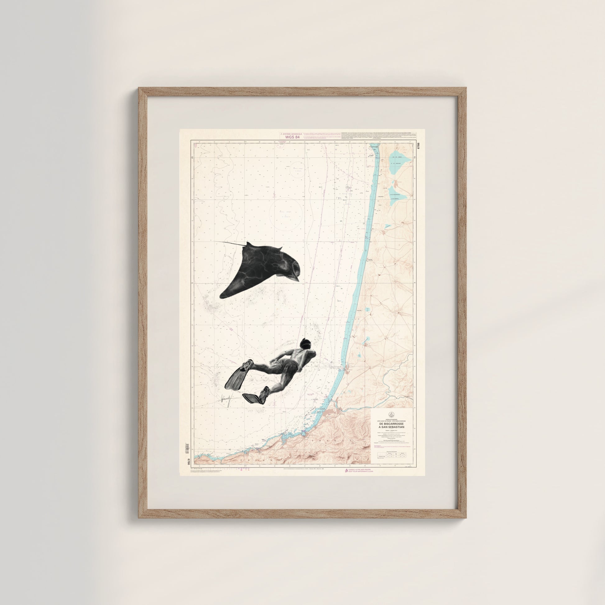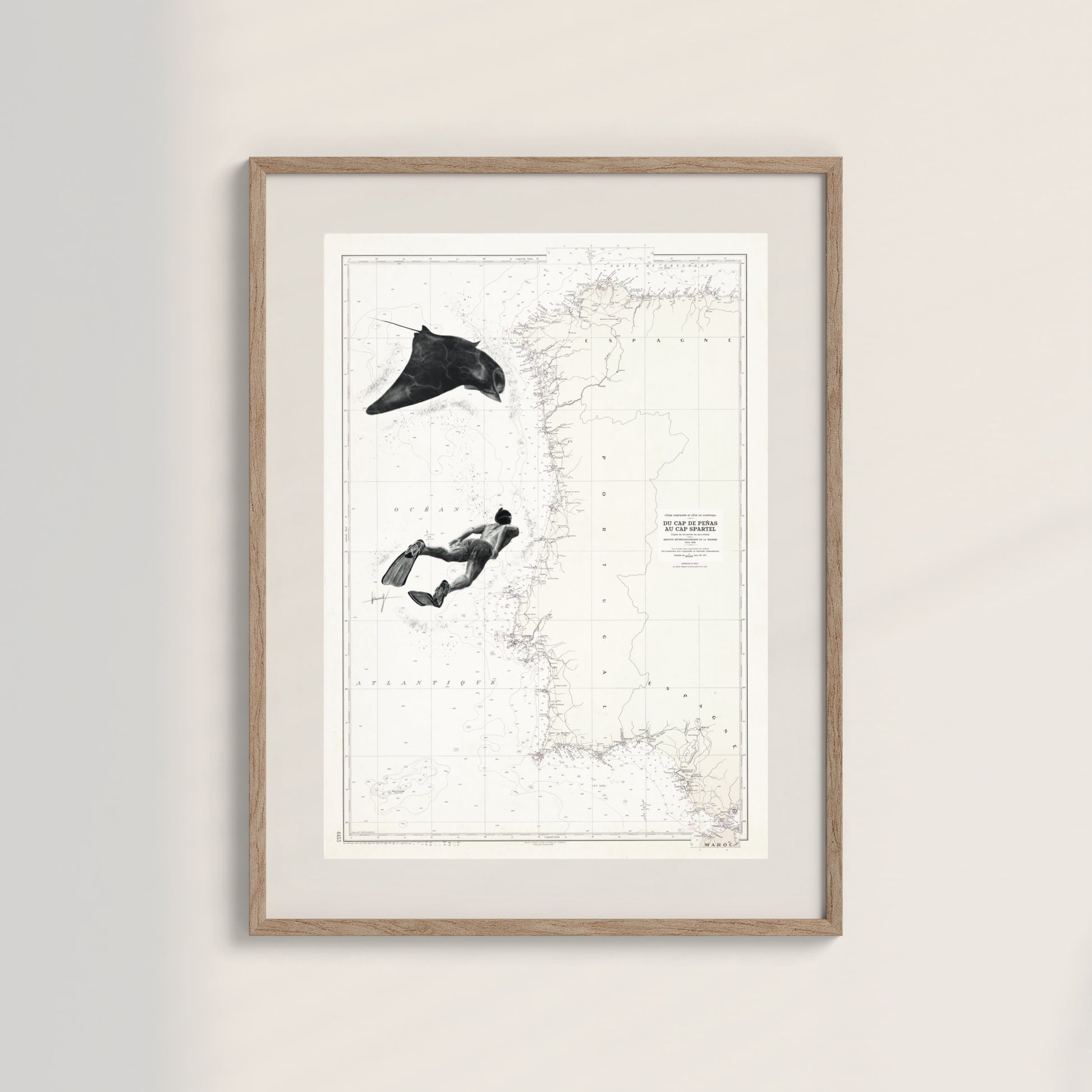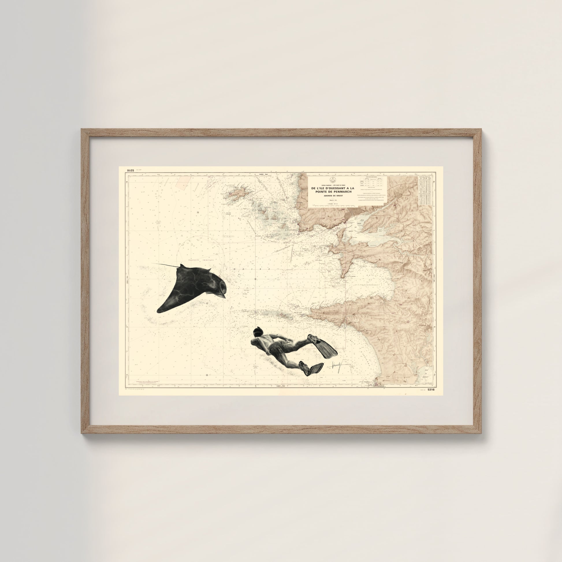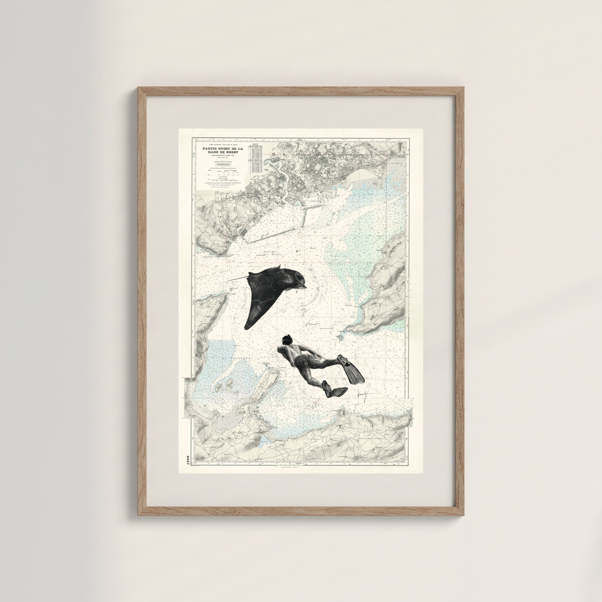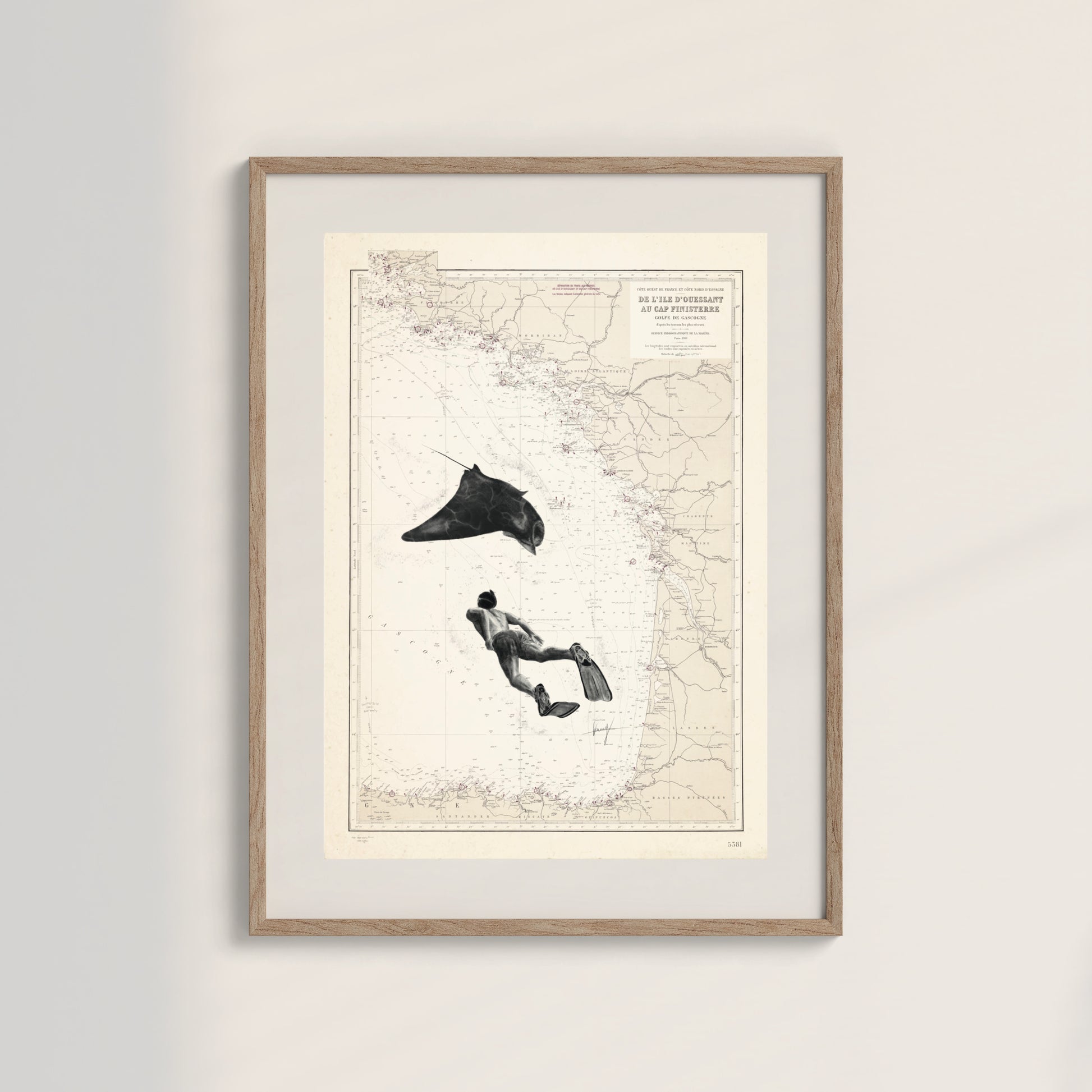 Reproductions de cartes marines anciennes illustrées au dessin numérique d'un plongeur et d’une raie manta.
