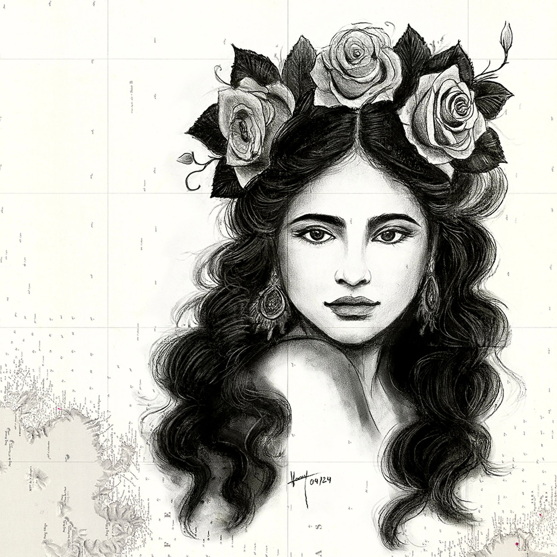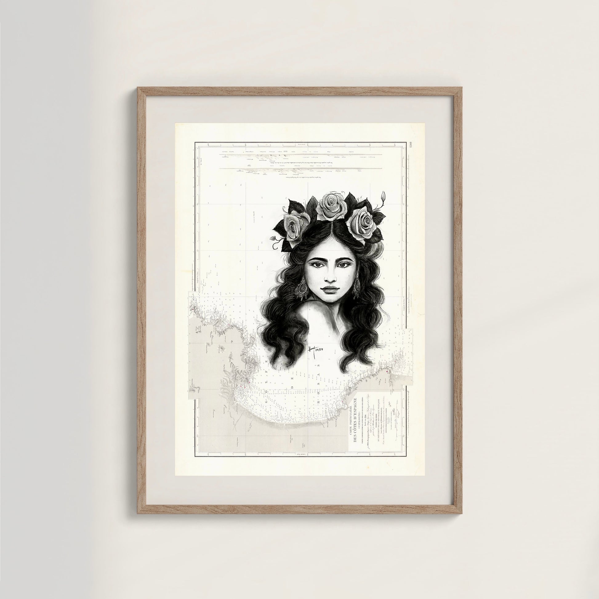Reproductions éditées à 30 exemplaires, numérotées et signées, de cartes marines anciennes d’Espagne (Catalogne du Cap Creux aux Îles de Mèdes) illustrées au fusain d'un portrait de femme couronnée de roses.