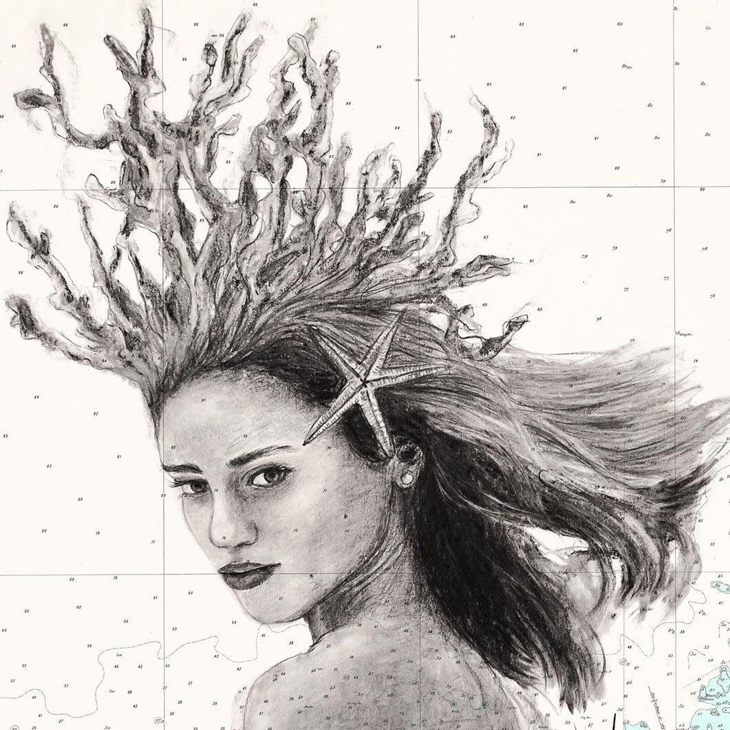 Reproductions éditées à 30 exemplaires, numérotées et signées, de cartes marines anciennes de Bretagne (de Pontusval à l’Île de Batz) illustrées au fusain d'un portrait de sirène coiffée d’une couronne de corail.