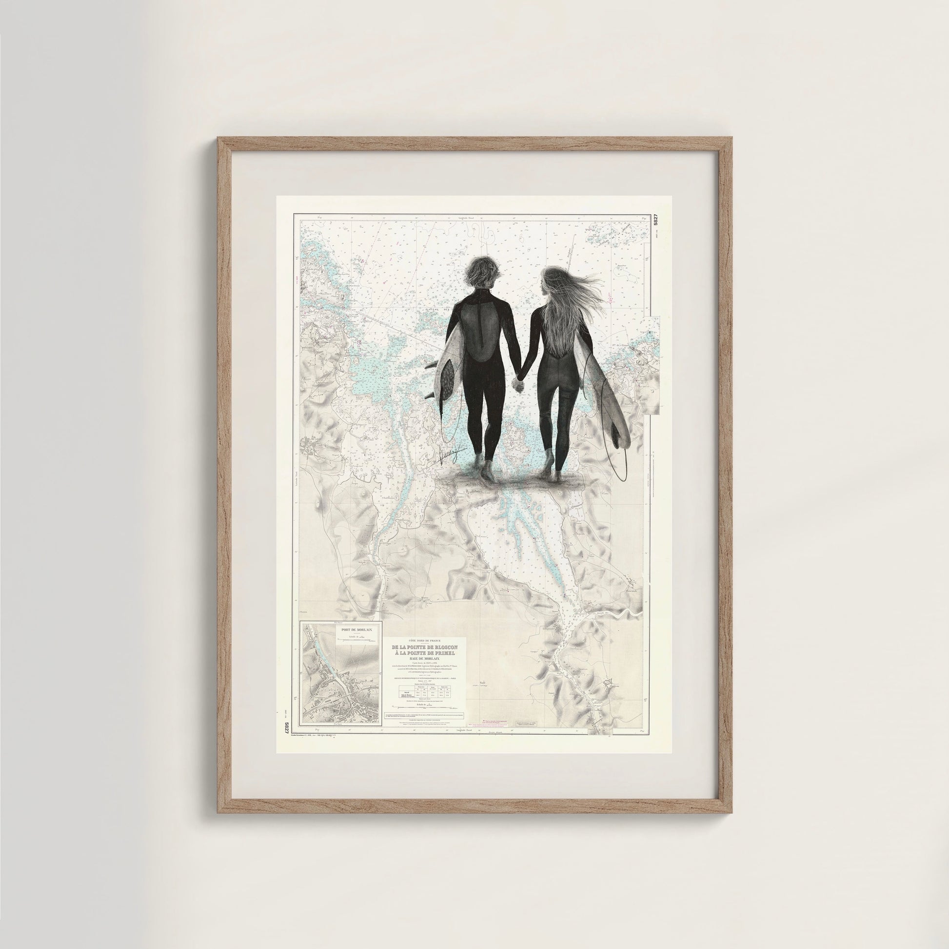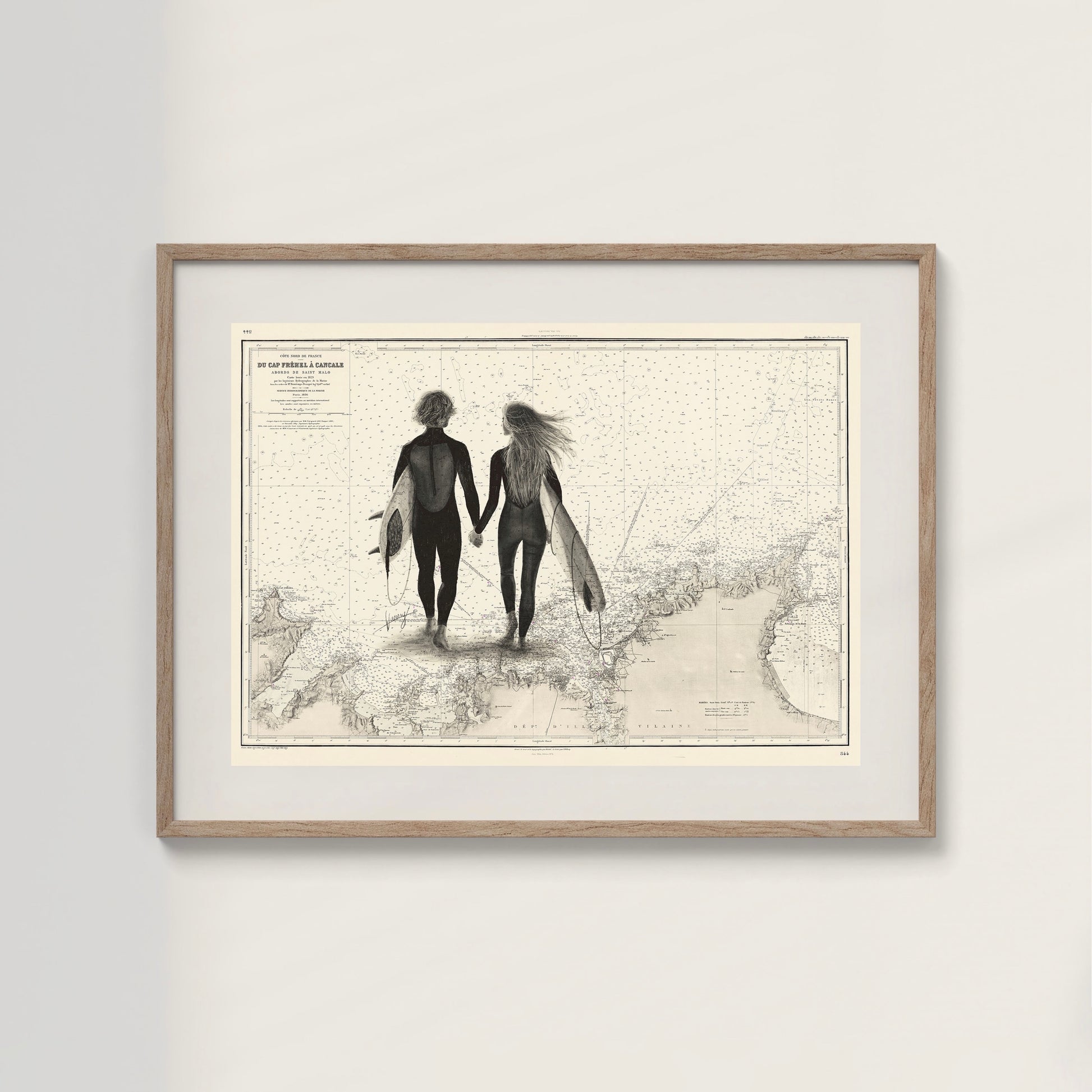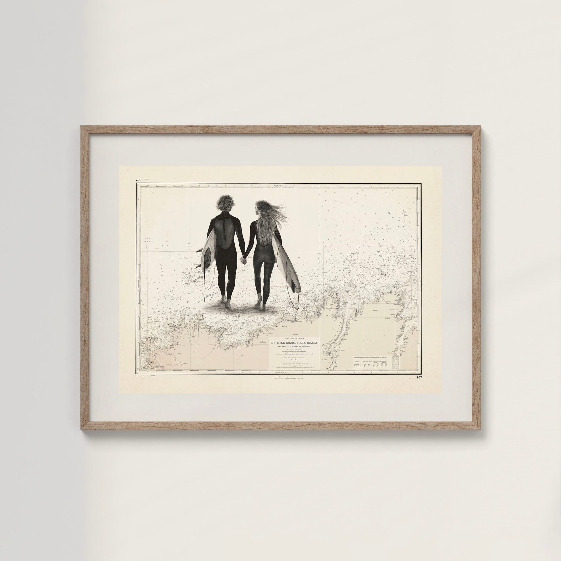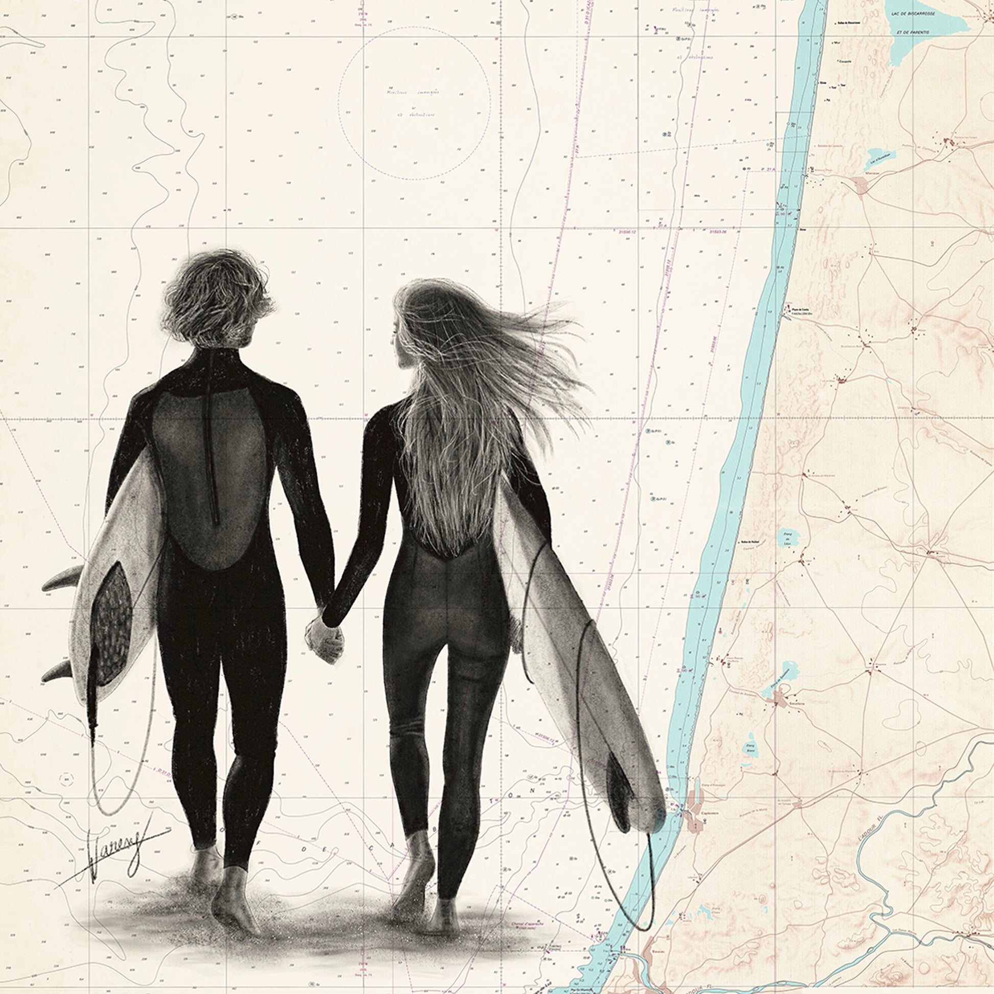 Reproductions de cartes marines anciennes illustrées au dessin numérique effet fusain d'une surfeuse et d’un surfeur se tenant par la main.