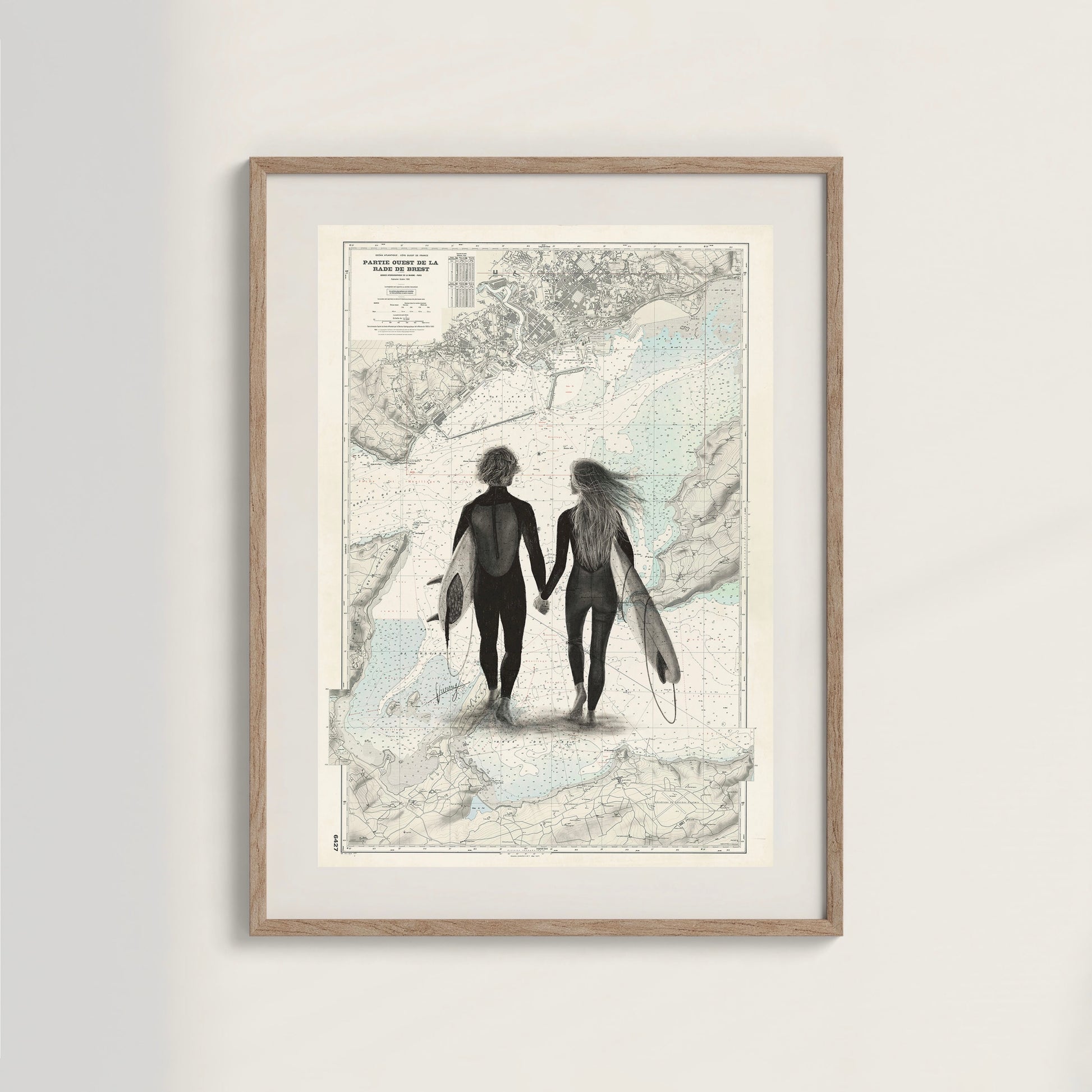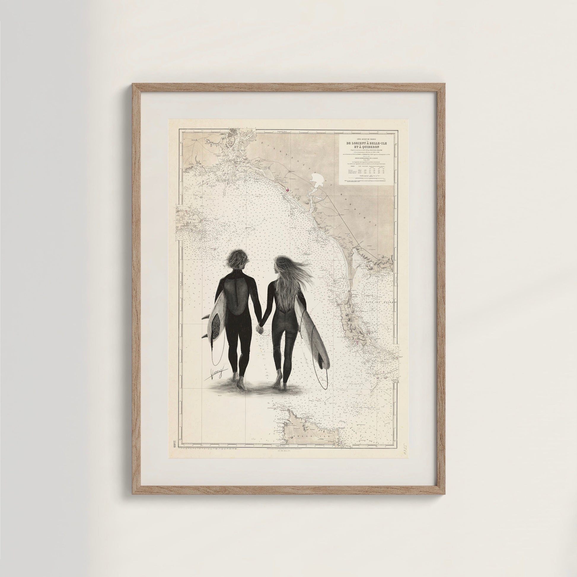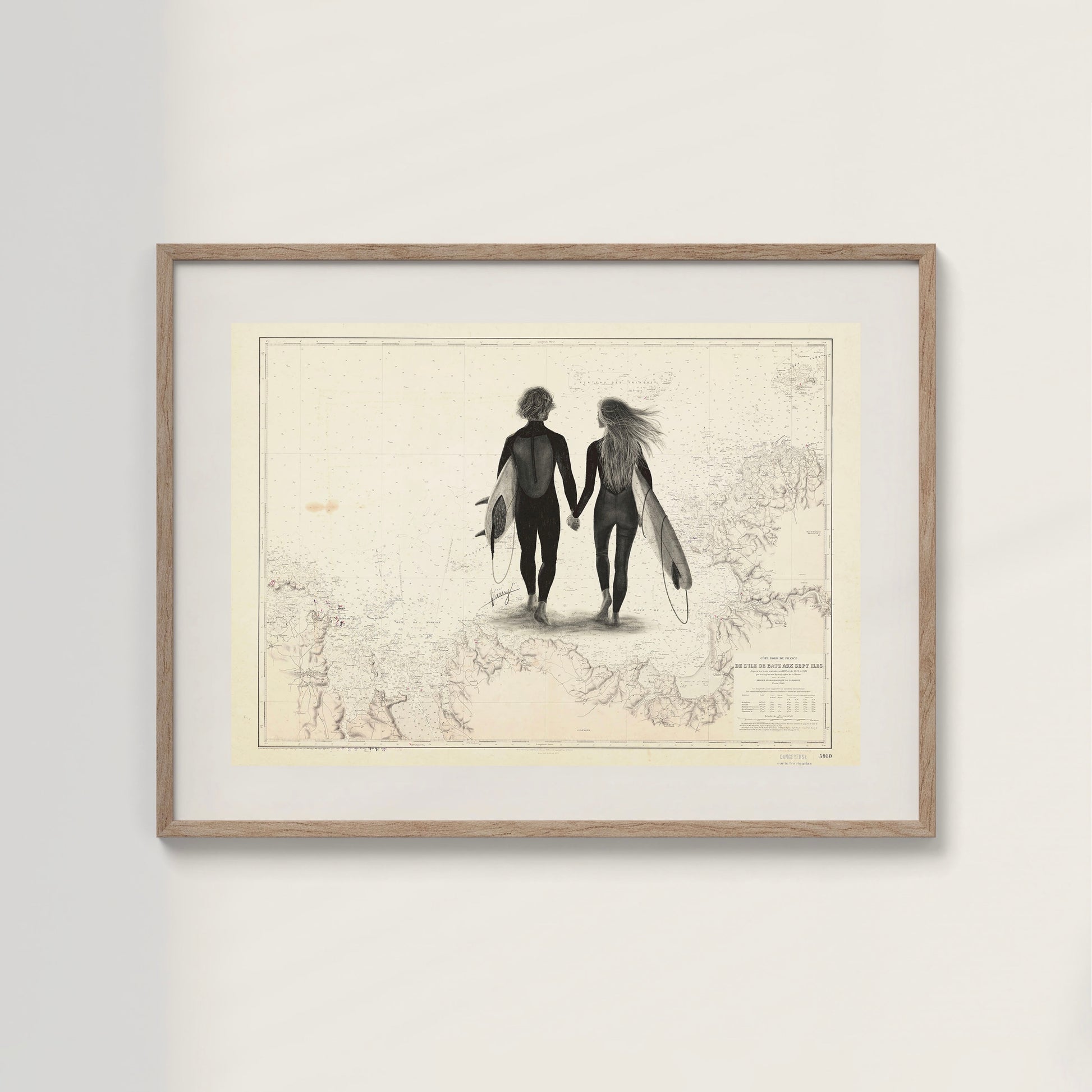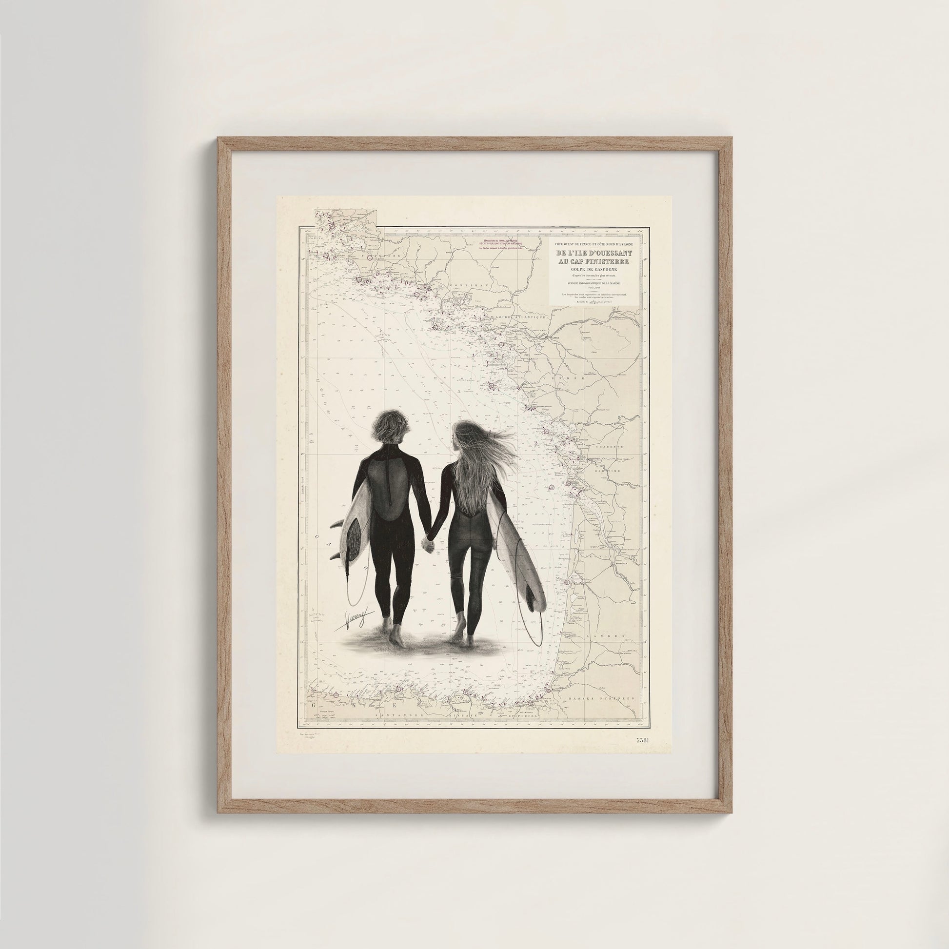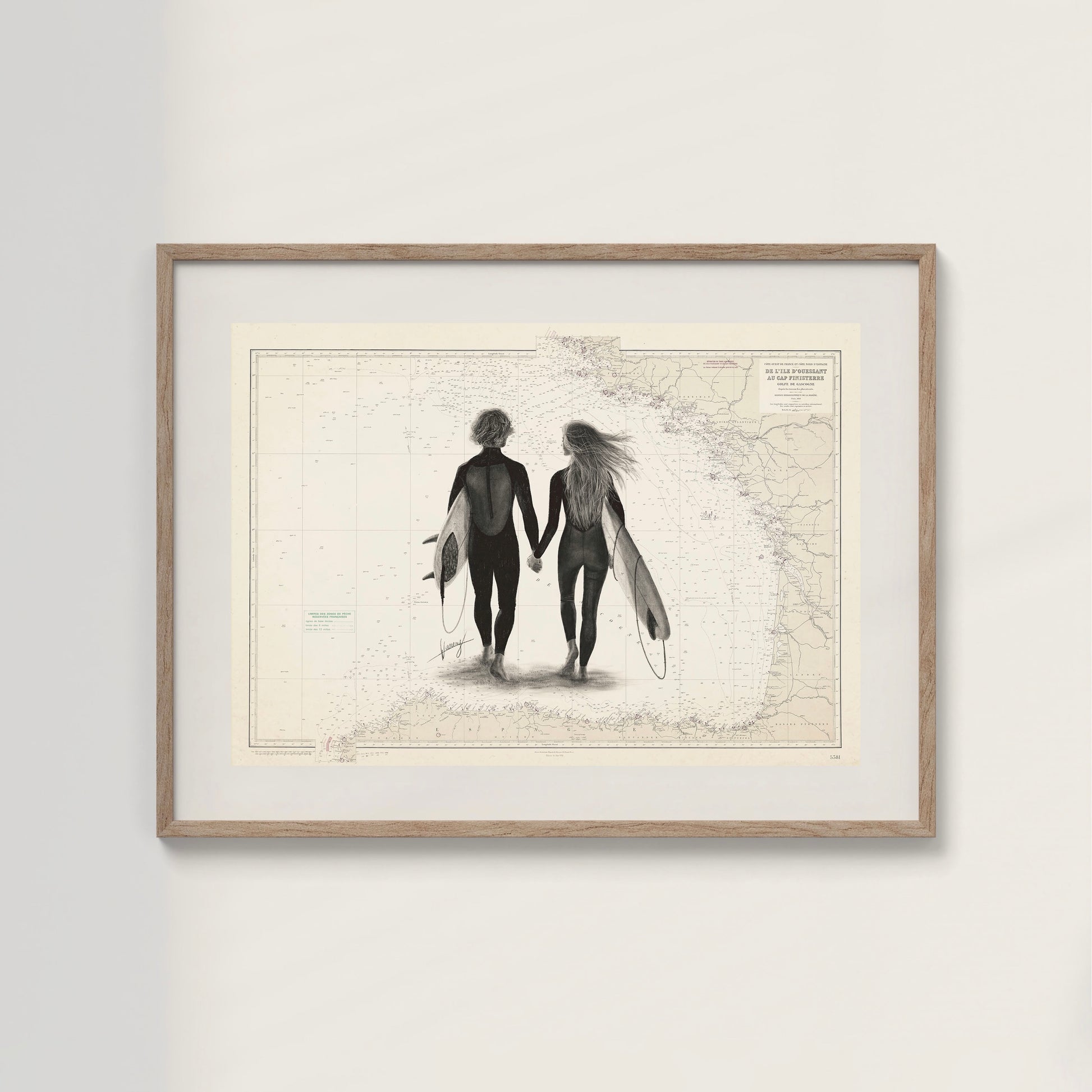 Reproductions de cartes marines anciennes illustrées au dessin numérique effet fusain d'une surfeuse et d’un surfeur se tenant par la main.