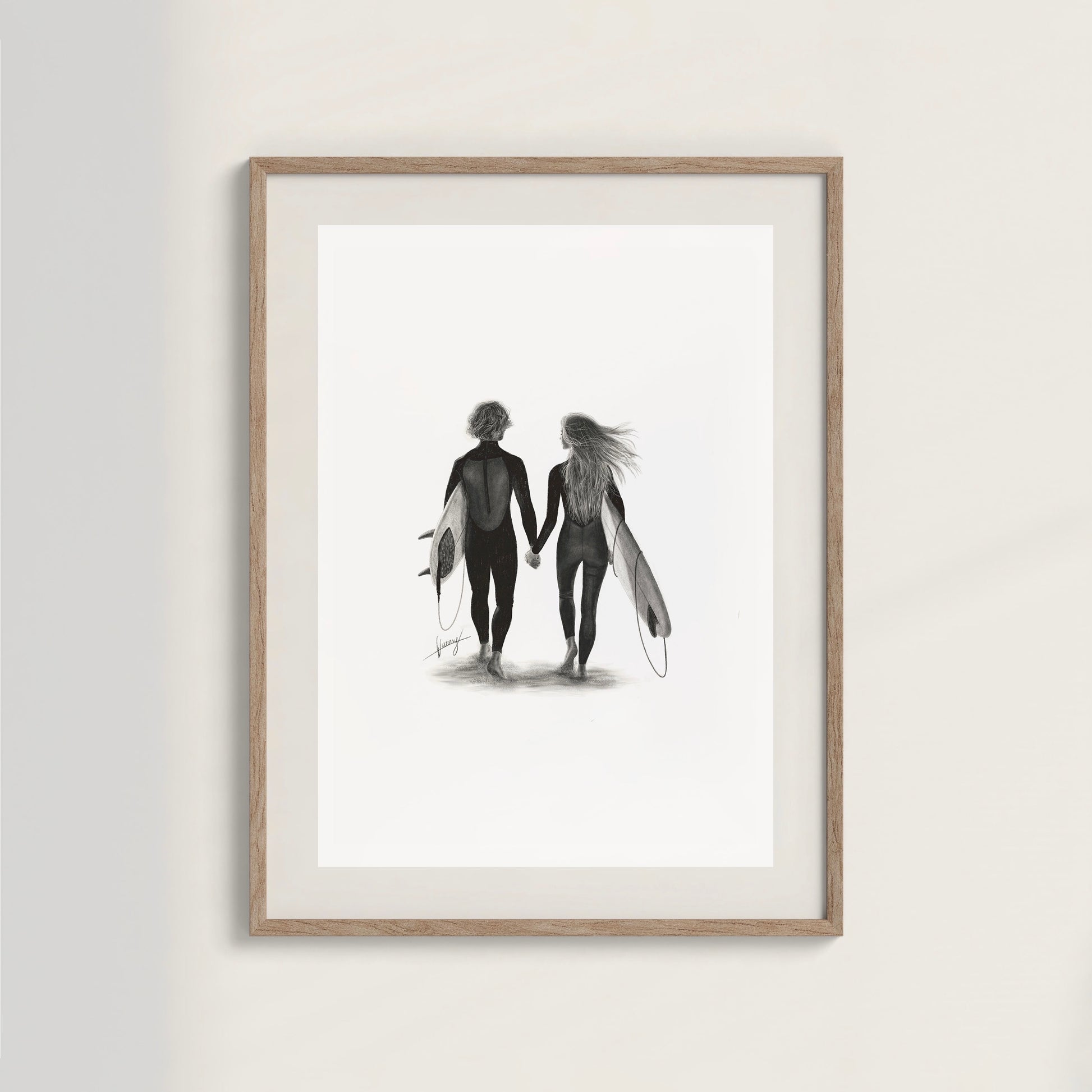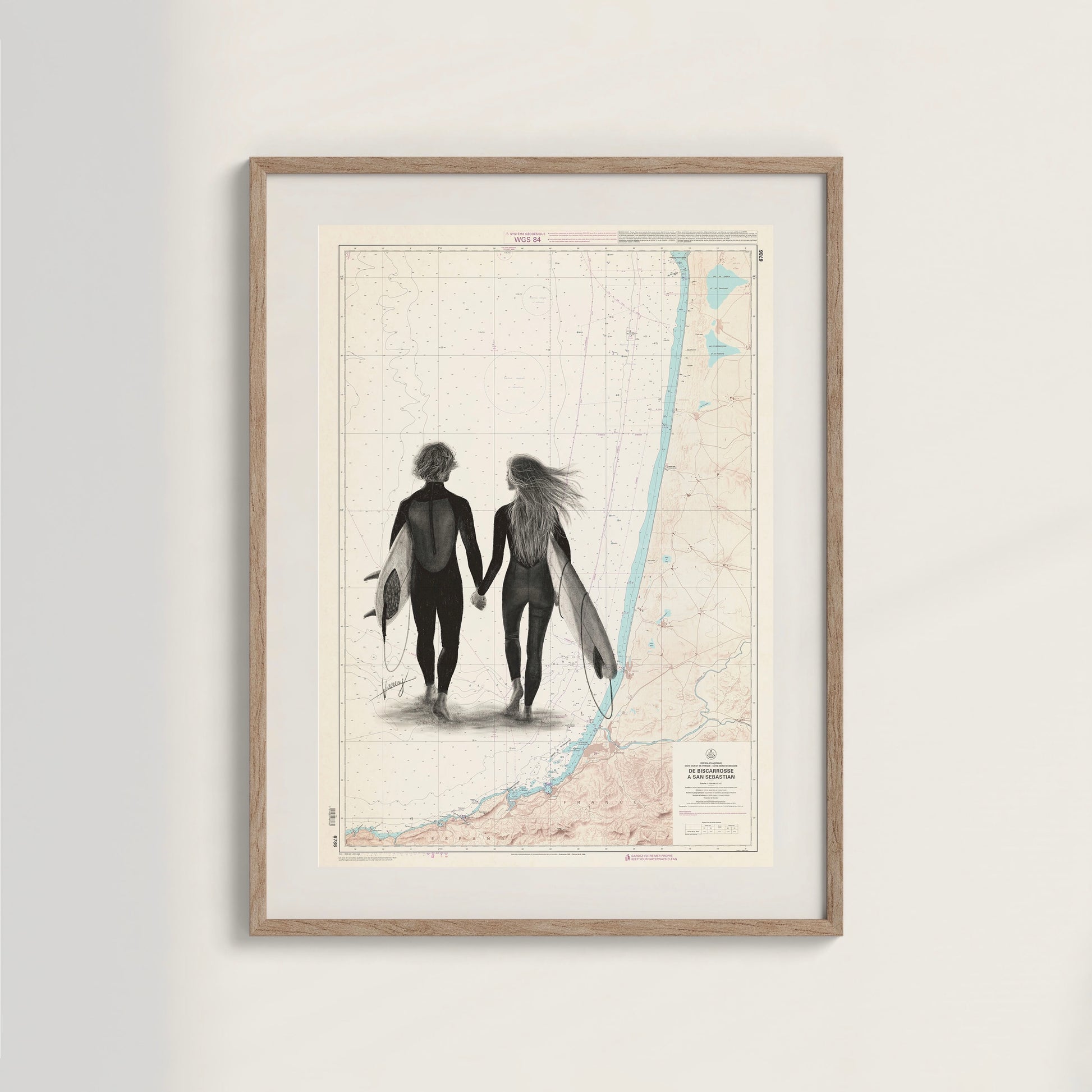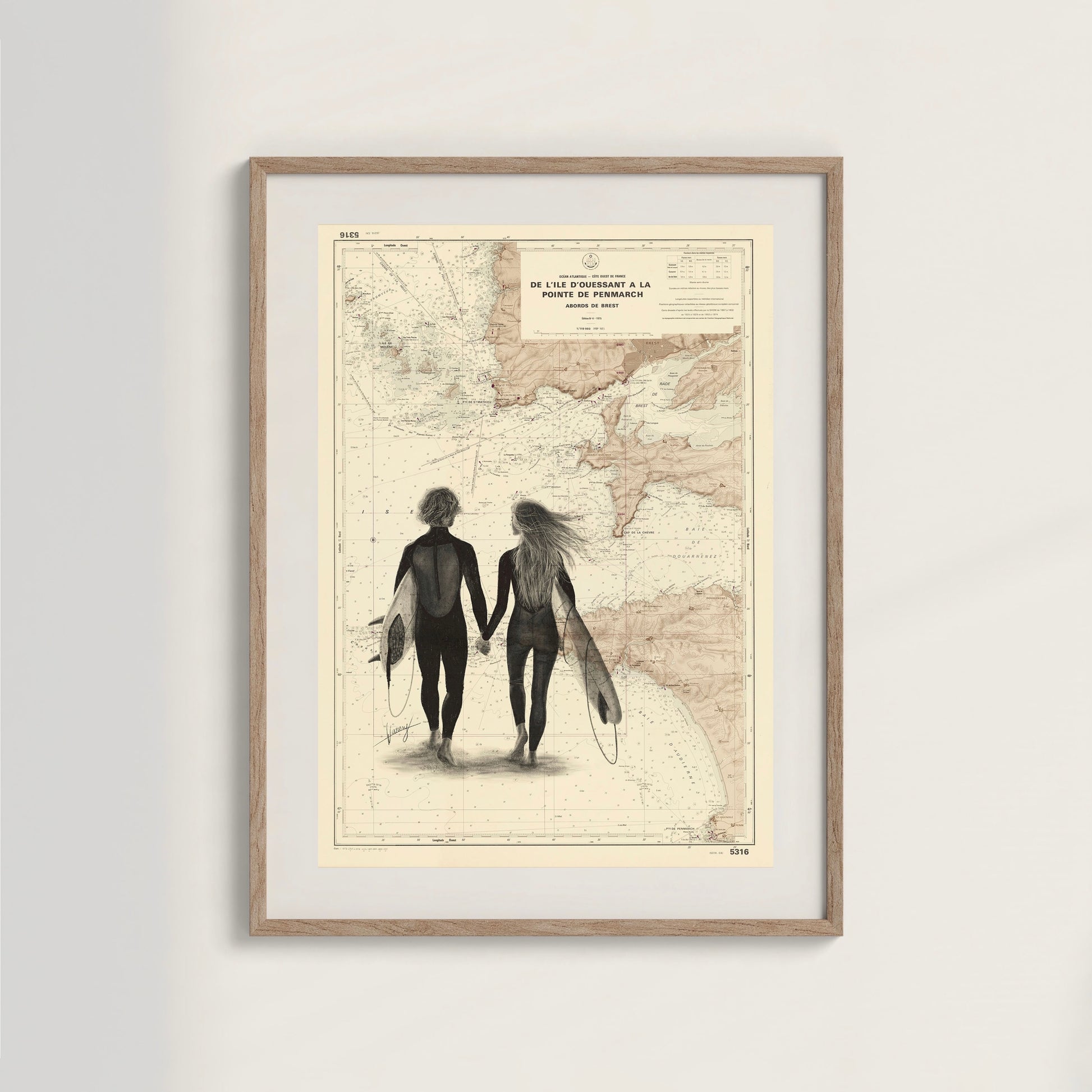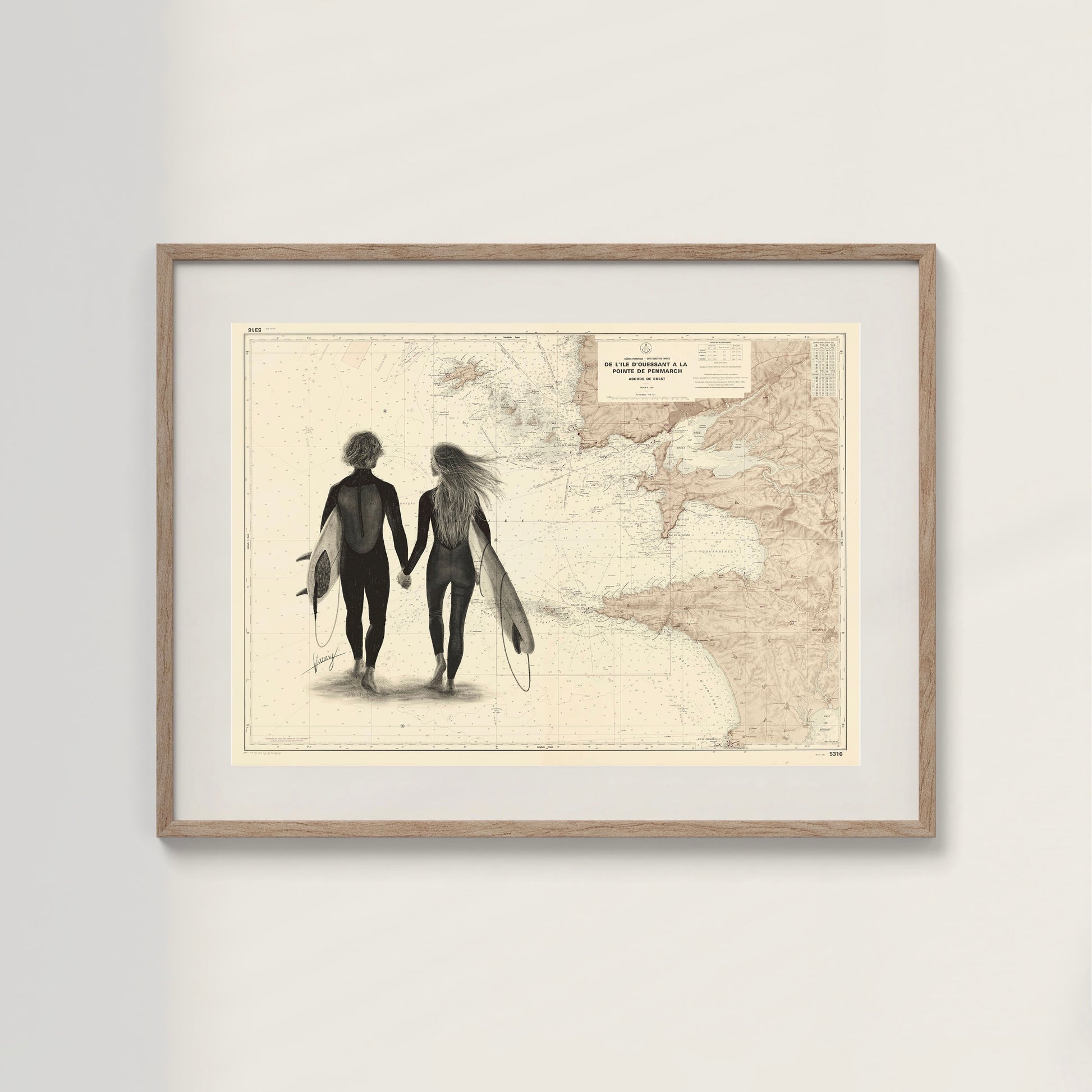 Reproductions de cartes marines anciennes illustrées au dessin numérique effet fusain d'une surfeuse et d’un surfeur se tenant par la main.