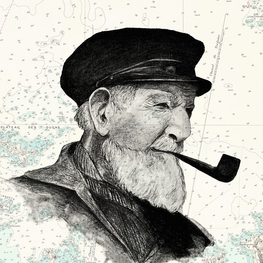Reproductions éditées à 30 exemplaires, numérotées et signées, de cartes marines anciennes de Bretagne (Baie de Morlaix, de la pointe de Bloscon à la pointe de Primel) illustrées au fusain d'un portrait de marin.
