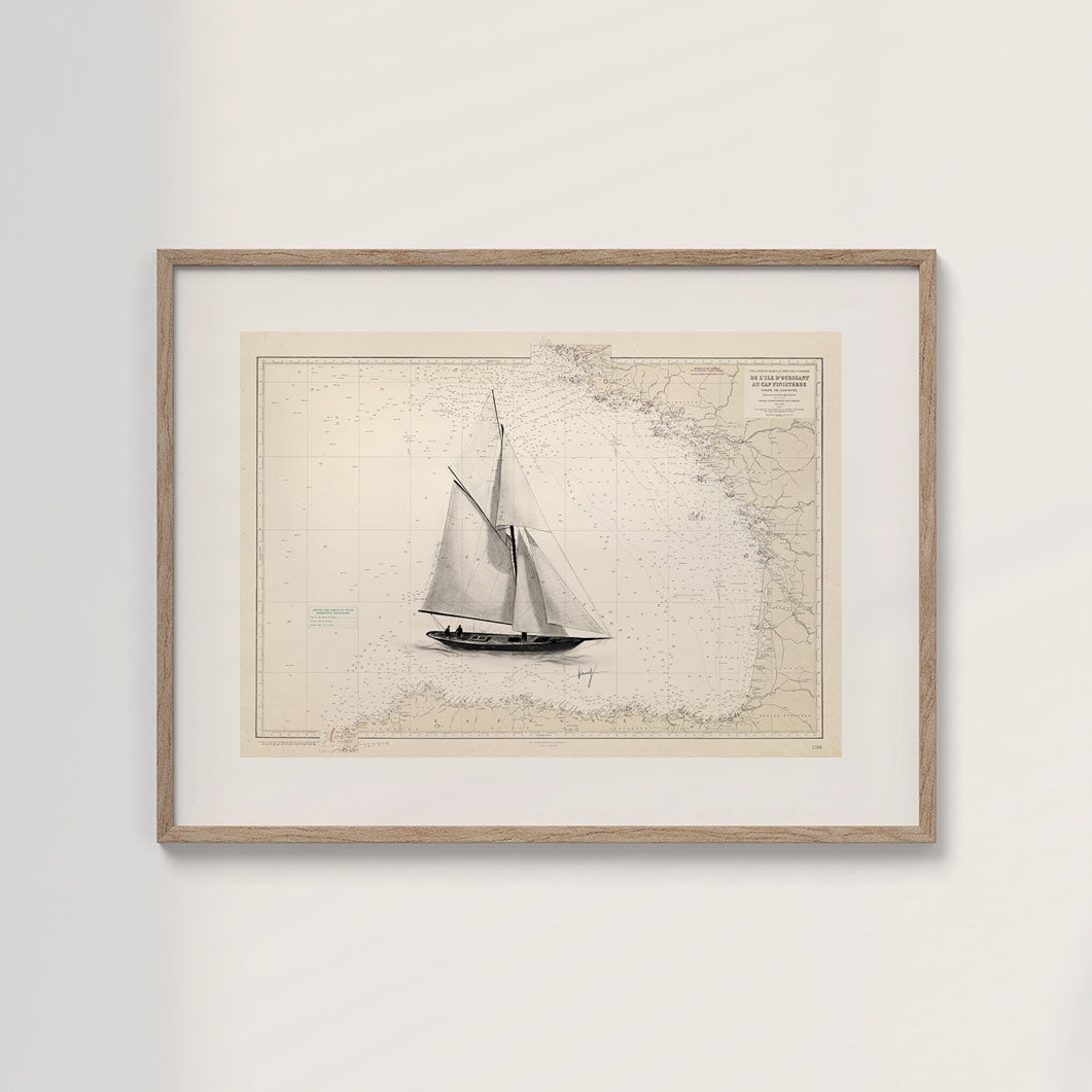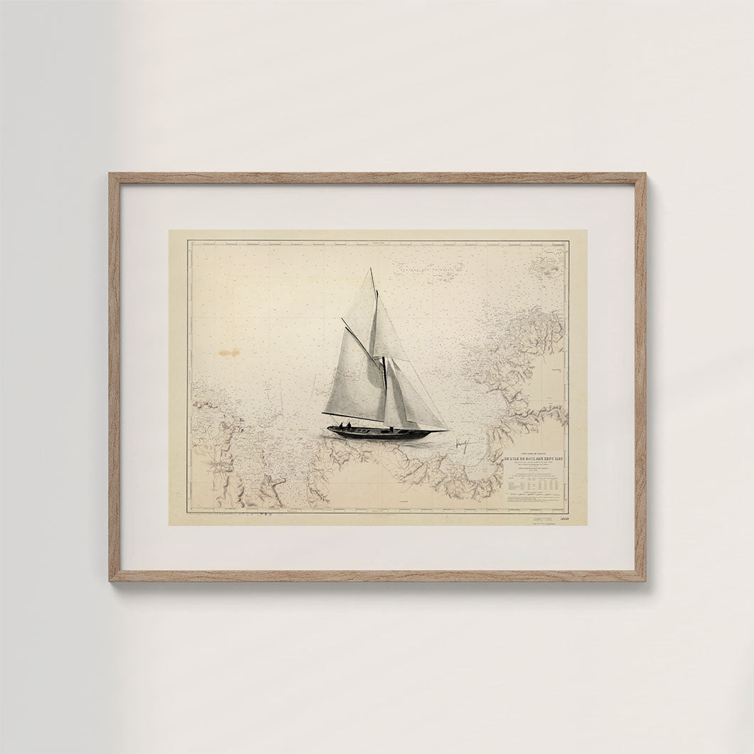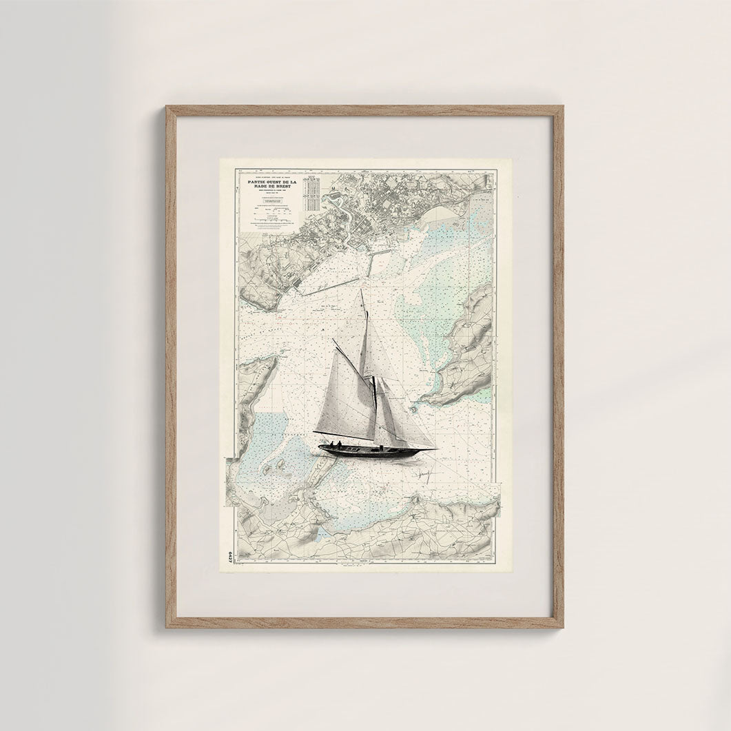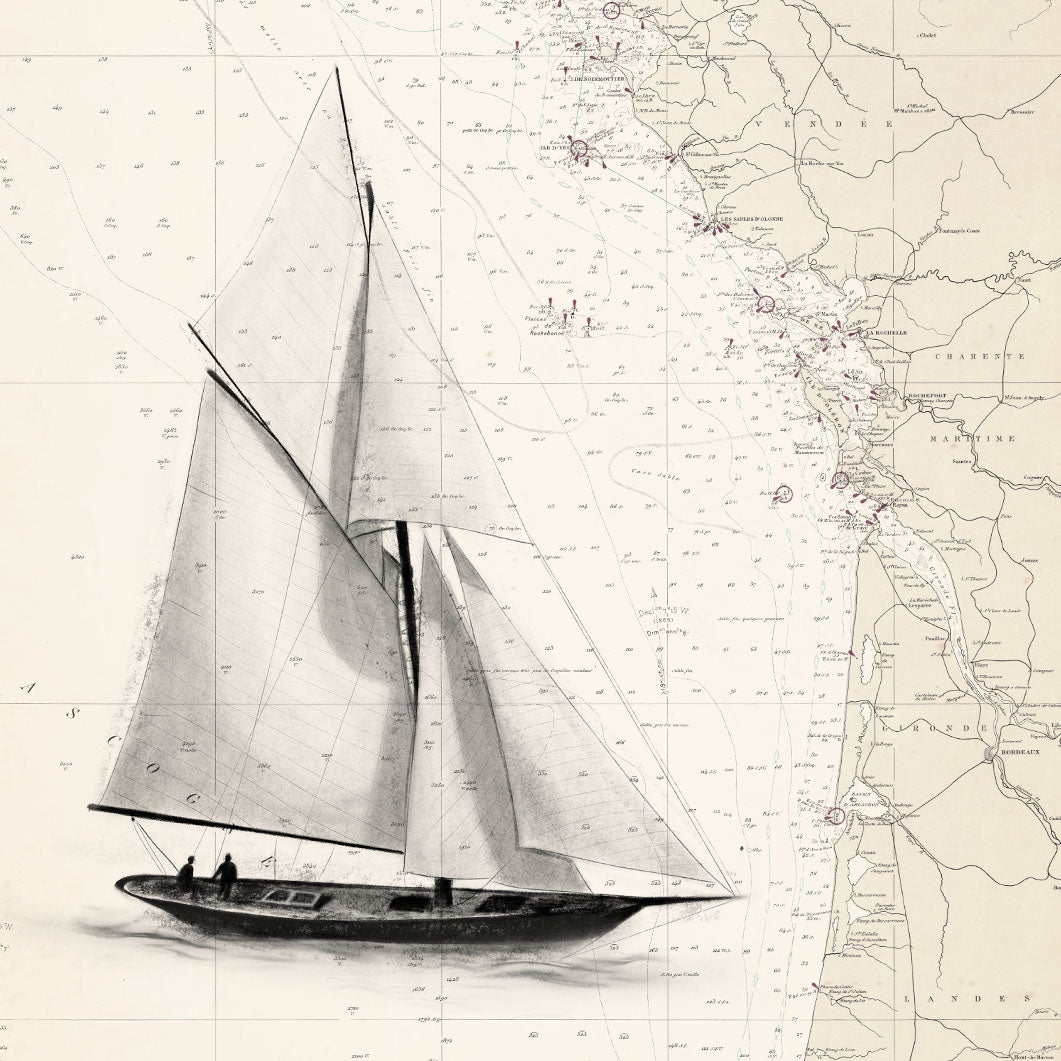 Reproductions de cartes marines anciennes illustrées au dessin numérique d'un voilier.