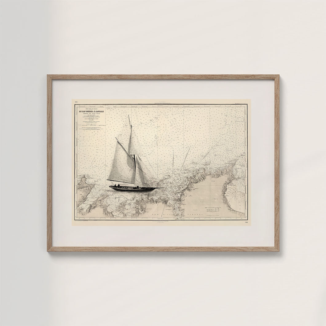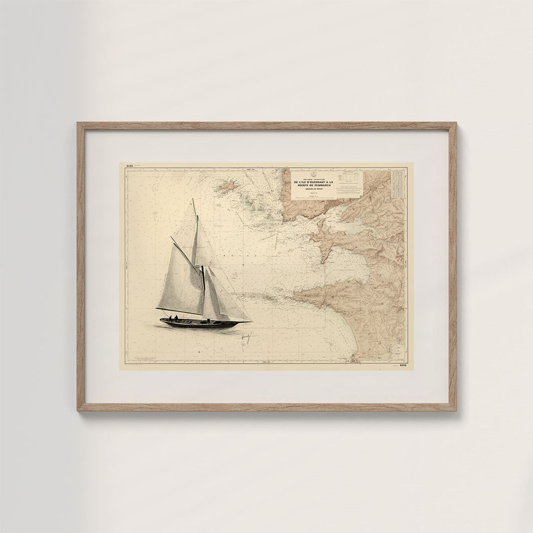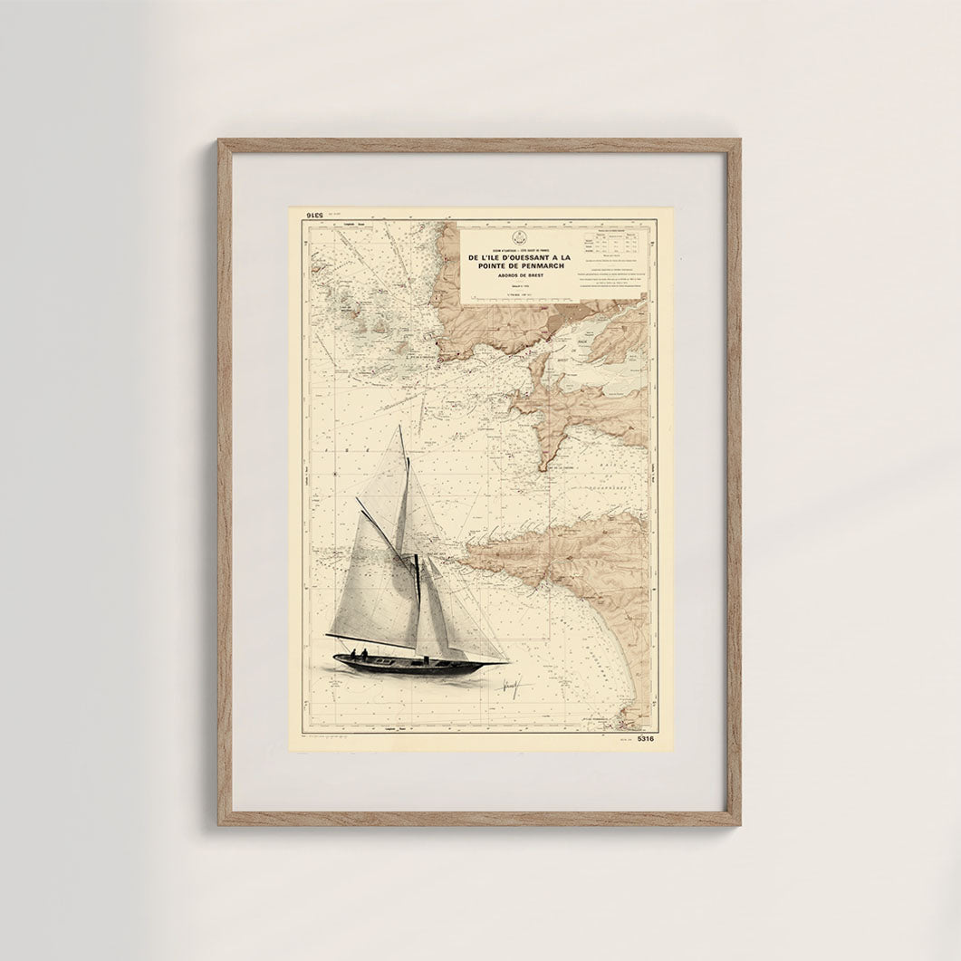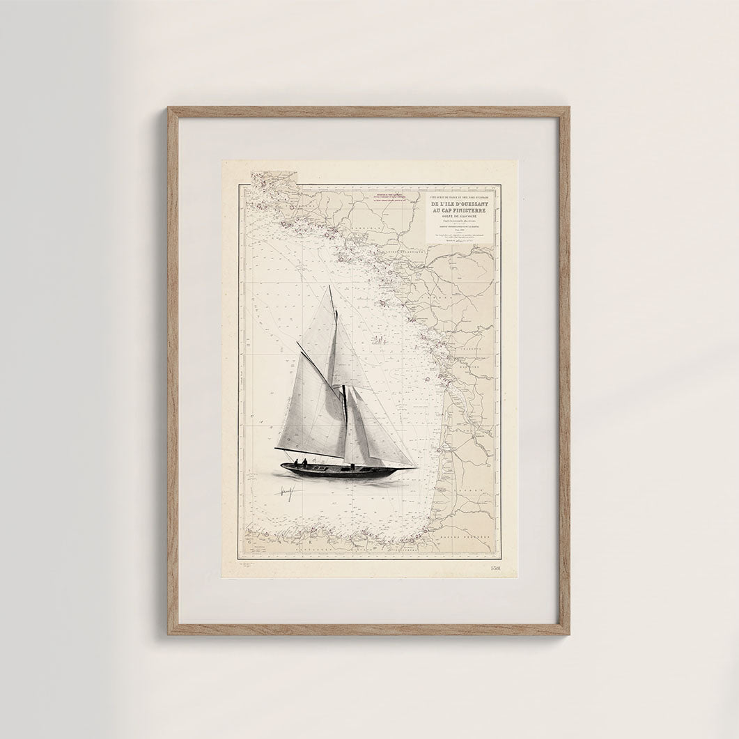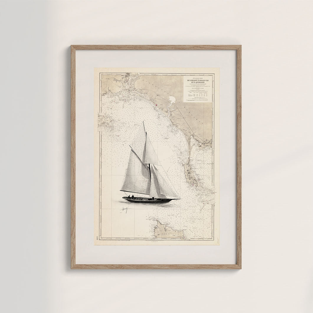 Reproductions de cartes marines anciennes illustrées au dessin numérique d'un voilier.