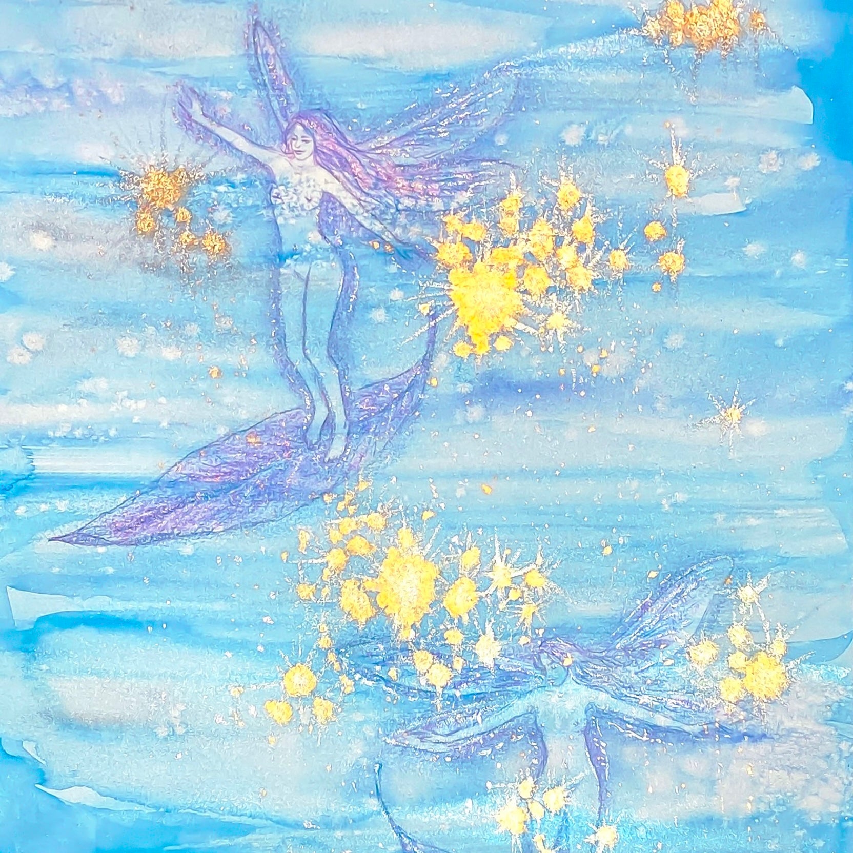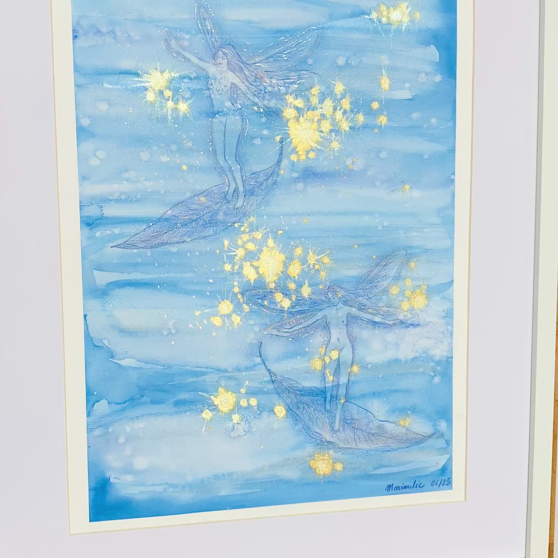 Ces deux petites fées jumelles glissent sur l’eau aux reflets d’or, portées par des feuilles légères et translucides. Leurs ailes se fondent dans l’eau, leurs corps dansent avec la lumière. Entre ciel et mer, elles célèbrent la joie simple d’exister, ensemble, en mouvement.