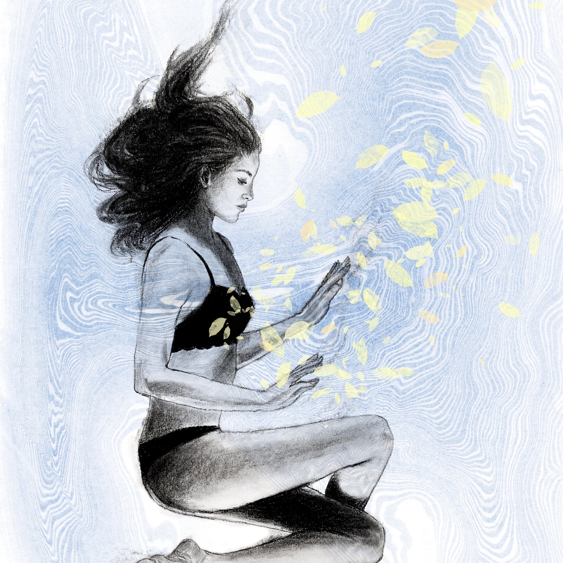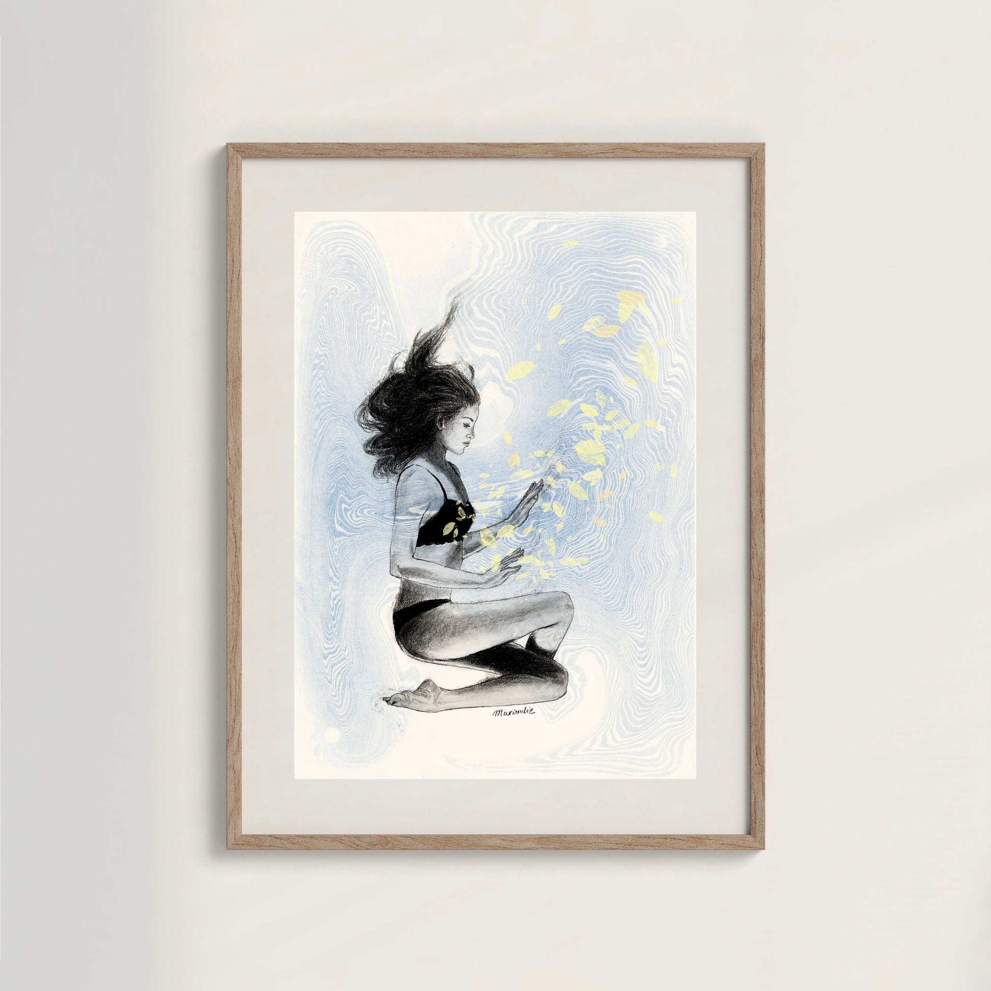 Reproduction illustration au fusain par Maximilie Hareng, sur fond imprimé suminagashi, par la créatrice Sandra Verré (Bulle d’Hygge).