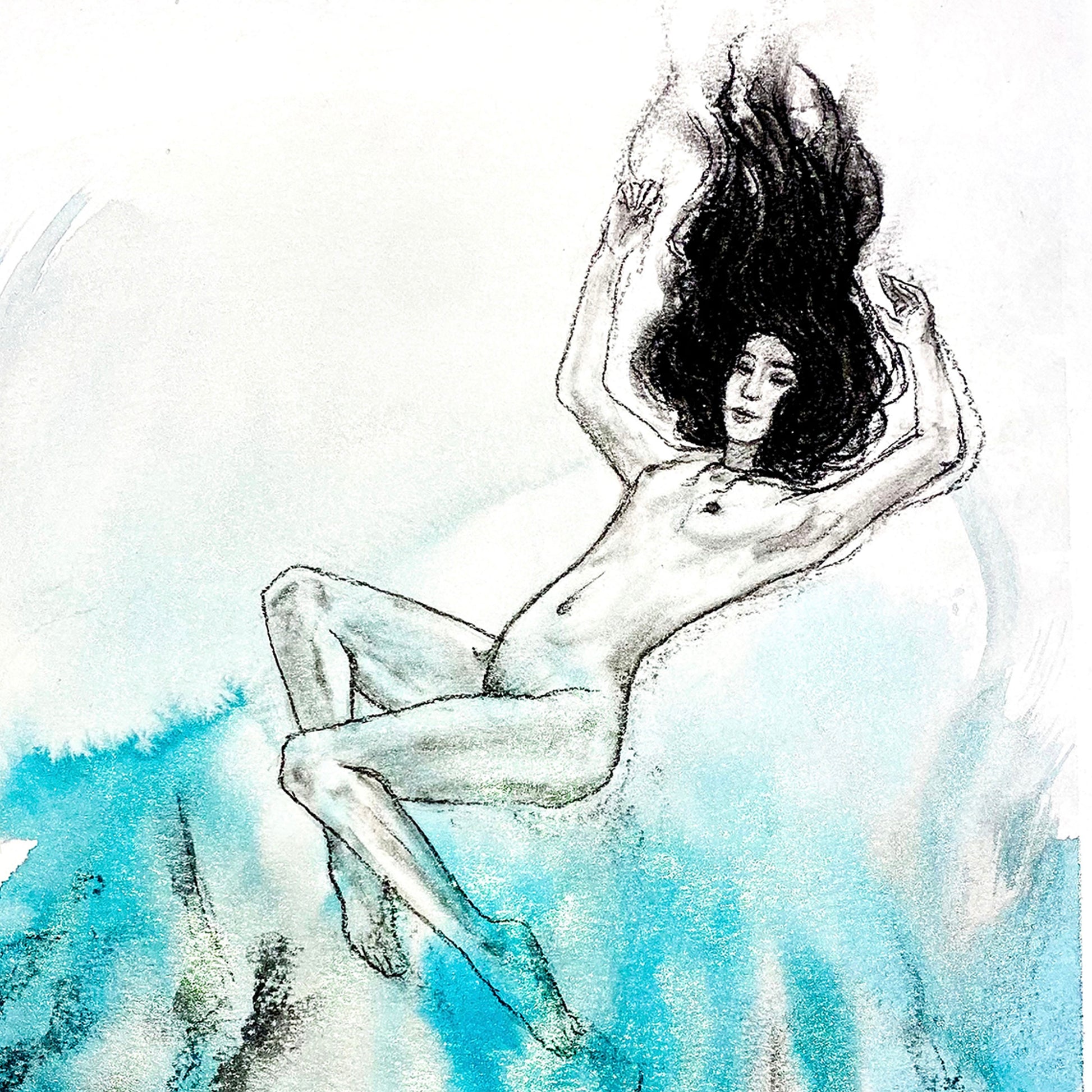 Reproduction illustration au fusain sur fond d’aquarelle.