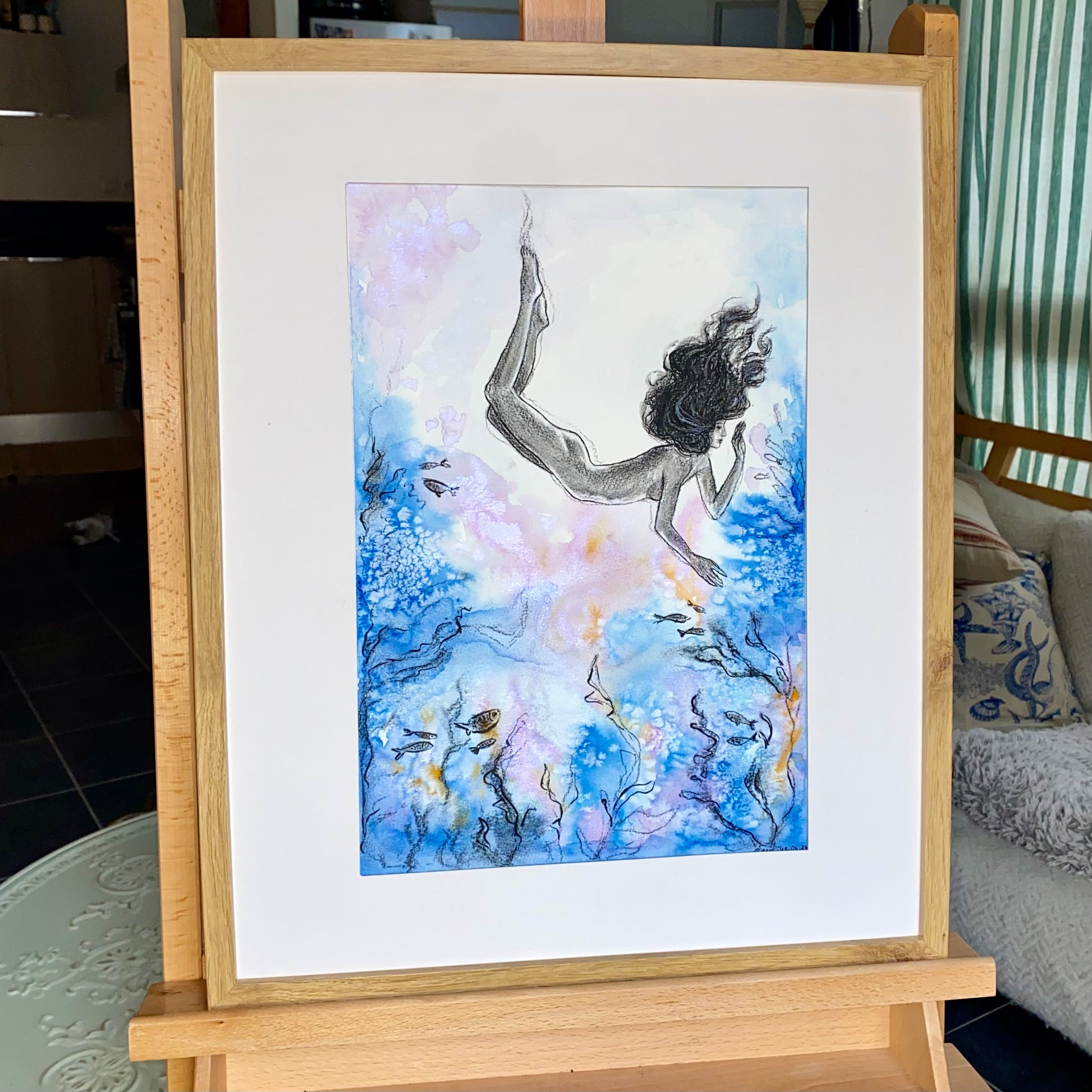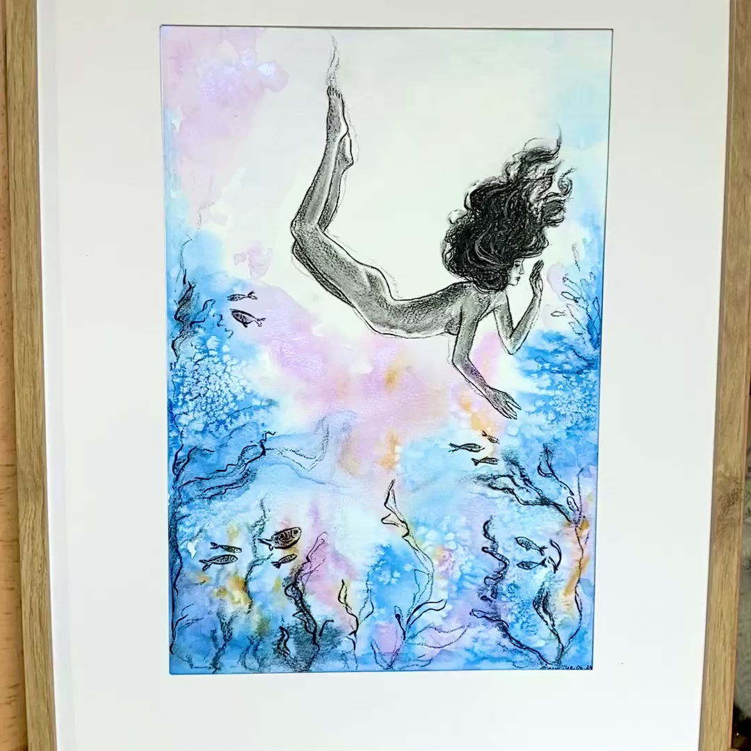 Illustration au fusain, sur fond d’aquarelle scintillante.