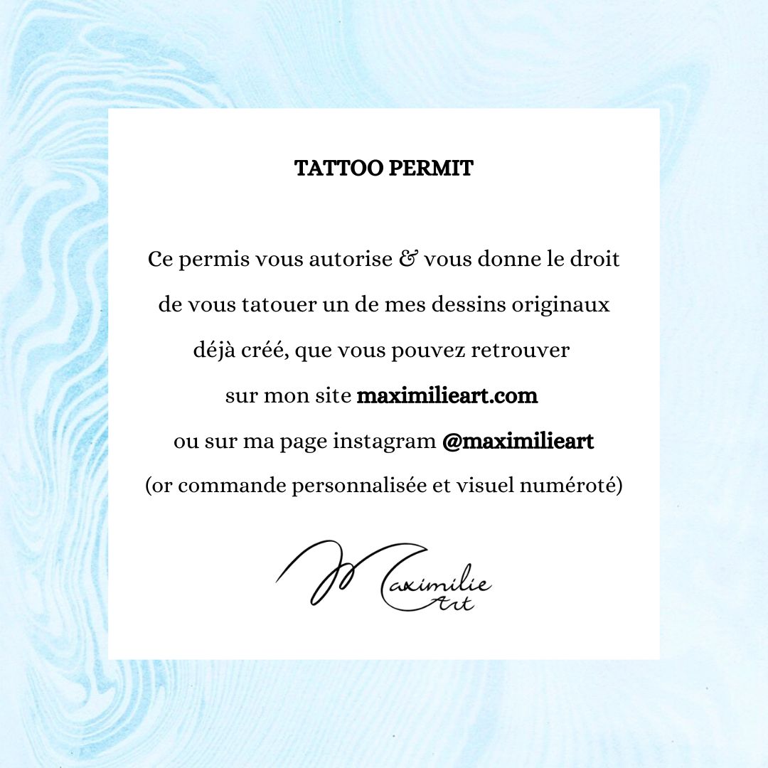 Ce permis vous autorise & vous donne le droit de vous tatouer un de mes dessins originaux déjà créé, que vous pouvez retrouver sur mon site maximilieart.com ou sur ma page instagram @maximilieart (or commande personnalisée et visuel numéroté).